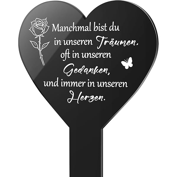 Wetterfest und beständig Der Edelstahl Stecker ist für sich eine sehr schöne Dekoration auf jedem Grab. Ich vermisse Dich jeden Tag Du fehlst mir an jedem Tag Ich vermisse Dich Wir vermissen euch Es gibt nichts schlimmeres, als einen geliebten Menschen zu verlieren. Neben Grabplatte, Urnengrabplatte, Gedenktafel, Trauertafel, kleinen Engeln, dem Grabstein, einer Grablaterne oder einer Grabkerze/Trauerkerze fügt sich dieser Grabschmuck wundervoll dezent ein. Wie tief der Verlust ist, kann nur der ermessen, der dem Verstorbenen nahe gestanden und ihn geliebt hat. Mit einem wetterfestem TrostGeschenk können Sie die Gedenkstätte würdevoll dekorieren. Sie können den Grabstecker einfach mit der an ihm befestigten Stange in die Erde stecken und ihn so zwischen Gestecken, Kerzen und Blumen auf dem Grab drapieren, wie Sie das wünschen. Dekorieren Sie die Gedenkstätte, das Grab, die Unfallstelle oder eine Blumenschale als liebevolle Erinnerung. Mit einem Edelstahl Grabstecker von Dolorino®, können klar definierte Botschaften hinterlegt werden und Liebe und Anteilnahme zum Ausdruck gebracht werden DOLORINO Grabstecker Stern 'Mein Stern', 38cm, Eine Schöne Grabdekoration, Eine Schöne Rituale und Zeichen bieten Trost in einer schweren Zeit und zeigen die Verbundenheit. In einer Blumenschale, von einem Floristen oder speziellen Trauerflorist angerichtet, ziert er lange die Gedenkstätte. Grab Deko Wetterfest Herz Grabstecker Bedruckt Am Ende Des Regenbogens Sehen Wir Uns Wieder Ca. 10 Cm Herz Grabschmuck Metall Auf dem Grab kann der Grabstecker zeigen, wie verbunden Sie mit dem Verstorbenen waren und dass Sie ihn immer im Herzen tragen. Emotionaler Grabstecker aus Edelstahl mit Trauerspruch für trauernde Menschen. Ideal zur Grabgestaltung und Trauerbewältigung