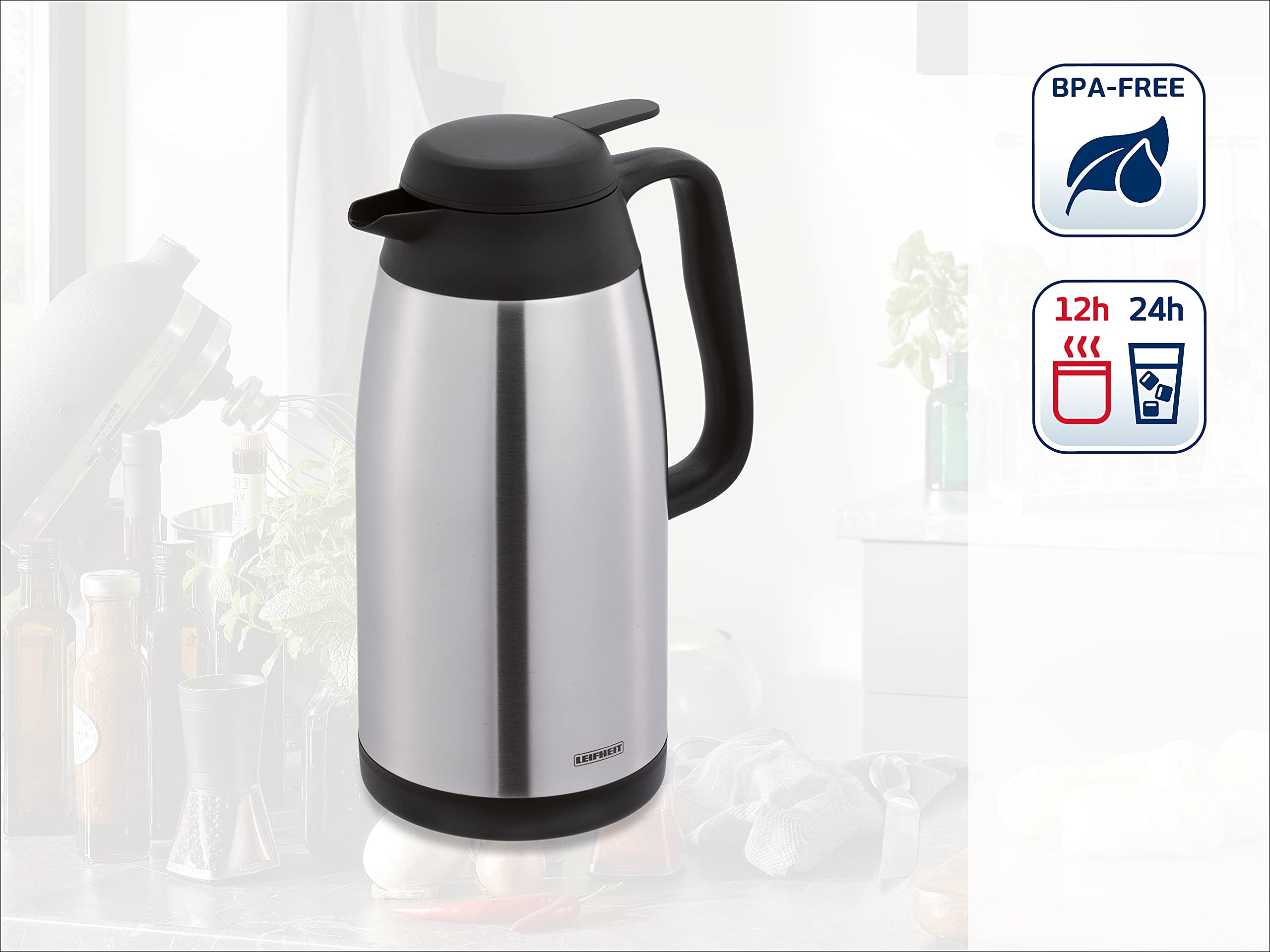 Leifheit Shine 1, 0 L Isolierkanne, 100% Dicht, Thermoskanne Mit Doppelwandigem Edelstahl-Isolierkörper, Praktisches Öffnen Und Schließen Mit Einer Hand, Kaffeekanne, Teekanne, Silber Schwarz