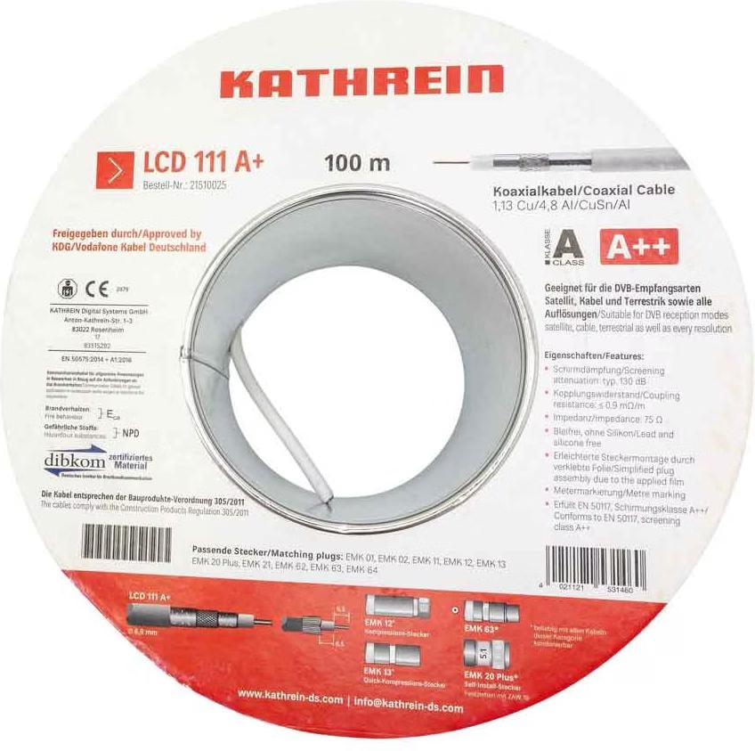 Koaxialkabel 10m 120db Weiß, 100 Meter Kathrein Lcd 111 A+ Koaxialkabel LCD-111 - KATHREIN-Vertriebsgesellschaft m.b.H rund Seit vielen Jahren liefert KATHREIN bereits das hochwertige Hausinstallations-Koaxialkabel LCD 111 (neuerdings unter der aktualisierten Bezeichnung LCD 111 A+) aus Kathrein LCD 111 A+ Koaxialkabel (1,13/6,9 mm, PVC, 100 m, Einwegspule, 75 Ohm) weiß 101,30 € Kathrein 21510025 Koaxialkabel Außen-Durchmesser: 6.90mm 75 120 dB Weiß 100m 114,26 Qualität vom Elektrofachhandel: Koaxialkabel Kathrein LCD 111 A+ light, UV-beständig, 250m Box bei der Elektroversand Schmidt GmbH bestellen.