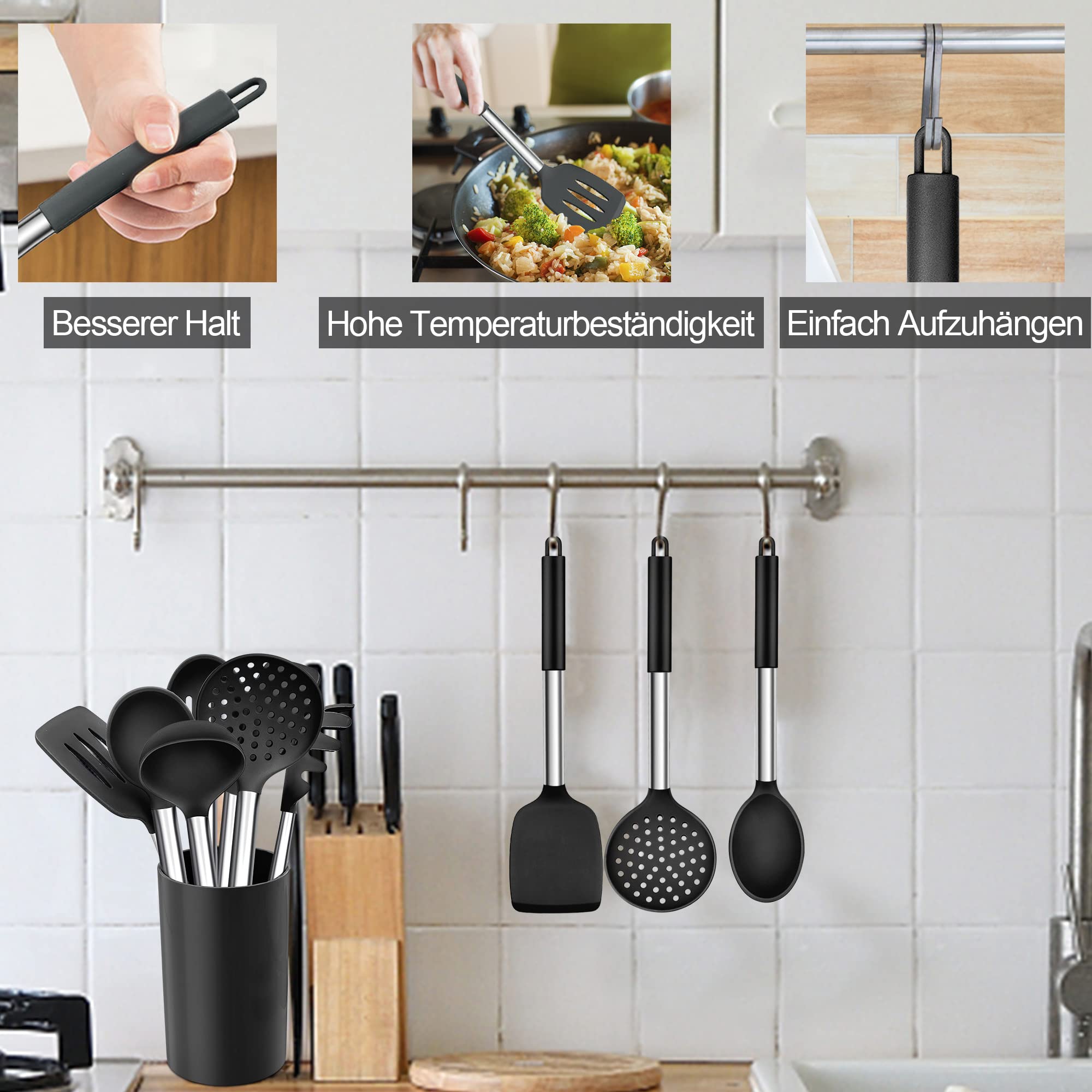 12 Stück Küchenhelfer Set, Silikon Küchenutensilien Set, Antihaft Hitzebeständiger Holzgriff Kochbesteck Mit Utensilienhalter, Silikonspatel Kochgeschirr Set, Spülmaschinengeeignet (Schwarz