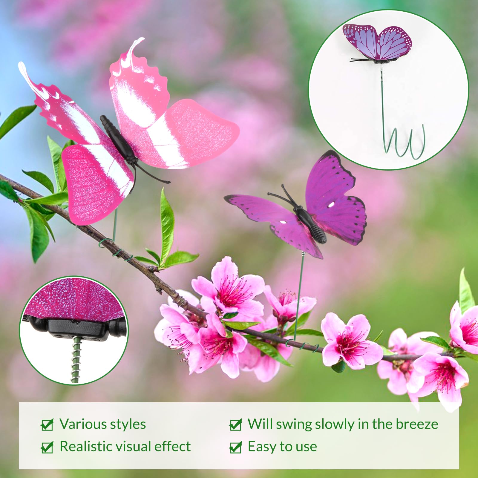 Schmetterling Deko 12 Stück Wasserdichte Garten-Schmetterlings-Pfähle, Dekoration Für Deko Klammern Lieferumfang: 24 Stück DIY-Garten-Schmetterlingspieße, Schmetterlings-Breite: 9 cm, Länge des Stabs: 25 cm, verschiedene Farben Materialien: Unsere Schmetterlings-Ornamente sind aus Kunststoff und Eisendraht, und die Schmetterlingspieße sind grün, was einen satten und realistischen Farbeffekt bietet Hochwertiges Material: Metallpfosten mit dicken PVC-Material-Schmetterlingen, sehr stark, nicht leicht durch starken Regen oder heiße Sommerhitzewellen zu ruinieren. Mehrere lebendige Farben: mehr als 10 schöne Farben, Gelb, Rot, Rosa, Schwarz, Lila usw. KZT 2978.9 - Strauß Schmetterlinge, Pflanzgefäß für Garten und Hof – 10 Stück, farbenfrohe, skurrile Schmetterlingspfähle, Dekoration für den Außenbereich, Blumentöpfe, Dekoration 2024. Preiswert Terrassendekoration online kaufen? Jetzt auf im Ausverkauf 50 Stück Schmetterlingspieße für Outdoor-Gartendekoration Lebendiger Schmetterling wie echt: Flügel können flattern, wenn der Wind weht. Vielseitig einsetzbar: Fügen Sie schöne Schmetterlinge zu Blumenvase, Blumentopf, Garten, Korb, Terrasse, Rasen, Urlaub oder Partydekorationen hinzu, um den Weihnachtsbaum zu dekorieren (der Metallpfosten kann gebogen und auf den Ast gewickelt werden), Muttertagskorb, als Geschenk usw.