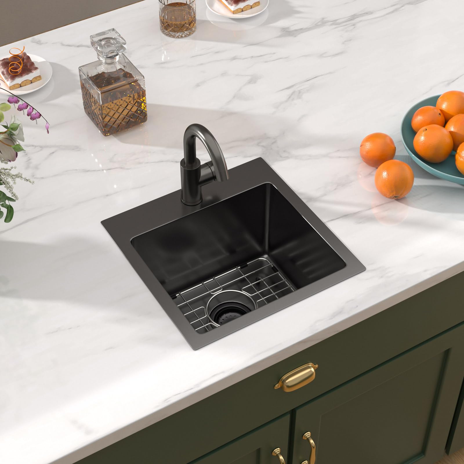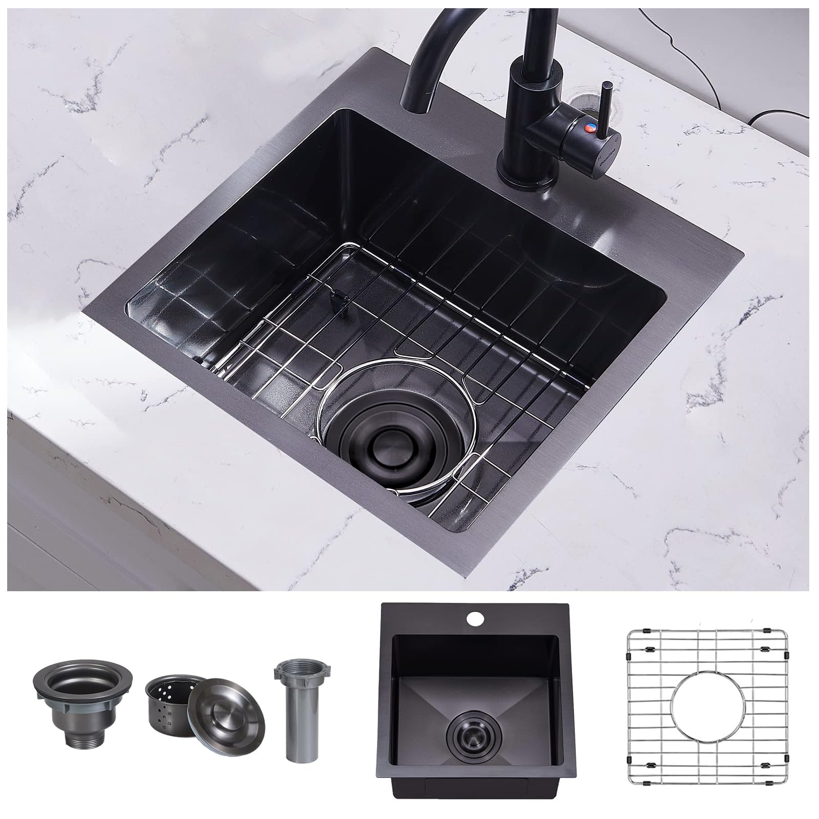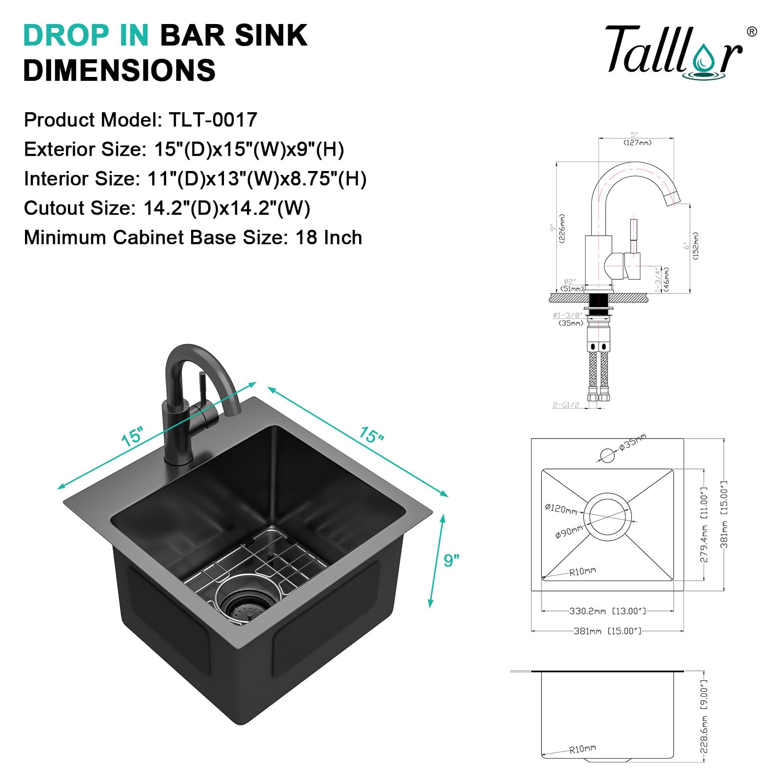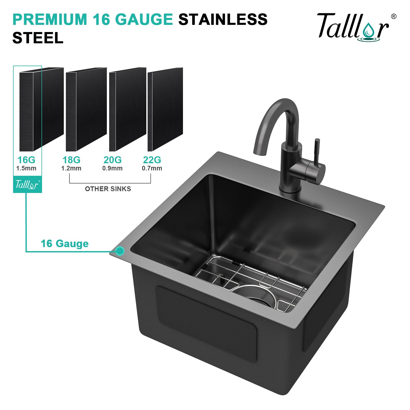 Talllor TLT-0017 Barspüle, 38,1 X 38,1 Cm, Schwarz, Kleine Nassstange, Vorbereitungsspüle, 16 Gauge, Edelstahl, Küchenspüle Mit Wasserhahn, Tiefe Wohnmobil-Spüle, Aufsatzmontage, Einzelbecken