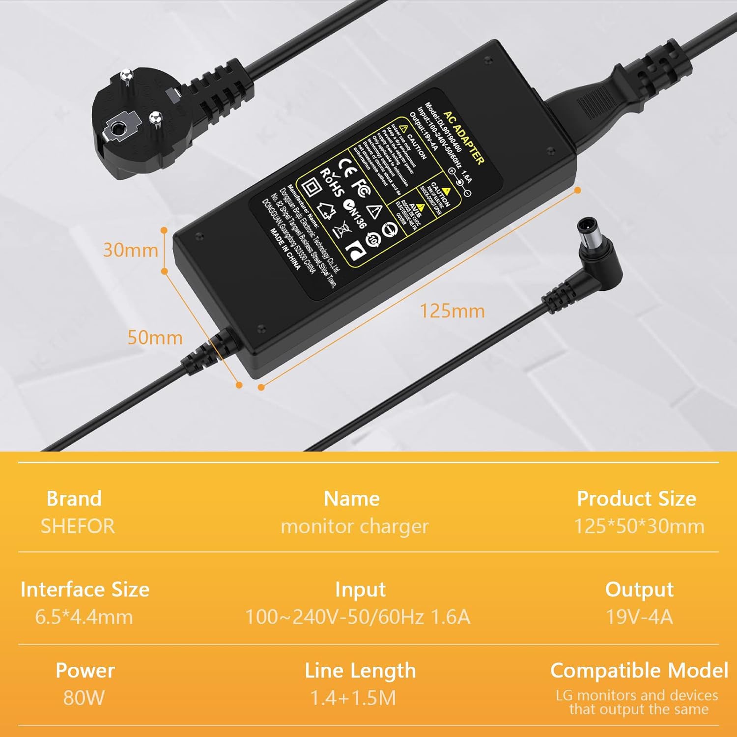 Beachten Sie die Größe des DC-Steckers. 19 LG LED Monitor: 19M37A;19M38A;19M45A;19EN33T-B;19EN33S;19EN33S-B;19EN33SW-B;19EN33SW;19EN33T;E1951S;E1951T;E1942C Lieferumfang: 1 Ersatz-Netzkabel für Ihren LG-Monitor., 12 Monate sorgenfreier Umtausch. Das Netzteil ist universell für zahlreiche LG Monitor Modelle geeignet: Unterstützt werden Bildschirme mit 19V Gleichstrom-Anschluss und Größen von 32 Zoll, 27 Zoll, 24 Zoll, 23 Zoll, 22 Zoll, 20 Zoll bis 19 Zoll. Ob LCD, LED oder HD TV Breitbild – die Kompatibilität ist hervorragend Spezifikationen: Eingang: 100–240 V, 50/60 Hz. n】 SICHERHEIT & ZUVERLÄSSIGKEIT: Alle LG-Monitor-Netzteile werden drei Endprodukttests und anschließend Alterungstests unterzogen, um Sicherheit und Verfügbarkeit zu gewährleisten. 24 LG LED LCD Monitor: 24M37A;24MC37D;24M38A;24M45D;24M47H-P;24MK400H-B;24MK600M-B;24MK430H-B;24M47VQ-P;24MP58VQ-P;24MP47HQ-P;24MP57D;24MP57VQ;24MC57HQ;24MP56HC;24MP56HN;24MP56HQ;24MP59G-P;24LB4510;24LB4510-PU;24MA31D;24MA31D-PU;24EN33S;24EN33T;24EN33TW;24EN33TW-B;24EN33T-B;24EN33V;24EN33V-B;24EN33VW;24EN33VW-B;24EN43T;24EN43V;24EN43V-B;24EN43VS;24EN43VS-B;24EA53T;24EA53VQ;24EA53V;24EA53V-P;24EC53V;24EC53V-P Langes Netzkabel: 1,5 m AC-Kabel und 1,5 m DC-Kabel. Bei Fragen oder Anregungen kontaktieren Sie uns gerne. Euro-Netzkabel, 2 , 2-polig, C7-Stecker, bipolares Kabel für PC... LG Monitor-Netzteil passend für: 27MK600M-B 27NK400H-B 27MP59G-P 29WN600-W 29UM59-A 29UM58-P 29UM68-P 24EN33TW 24EN33TW-B 24EN43VS 24EN43VS-B 24MP48HQ-P; UM57 25UM57 25UM57-P. Original Netzteil LG ADS 110CL 19 3 190110G Output: 19V 5,79A Kompatibel mit: LG Electronics 32 29 27 24 23 22 20 19 LED-LCD-Ultrawide-Monitoren und -Fernsehern. 22 Flatron LED Monitor: 22M35D;22M37A;22MC37D;22M38A;22MP56HQ;22MP57A;22MC57HQ;22MP47A;22M45A;22M47VQ;22M47H;22EN33S;22EN33S-B;22EN33T;22EN33T-B;22EA53T-P;22EC33T;22EC33T-B;E2242C-BN;22LB4510;22LB4510-PU;22LN4510 20 LG LED Monitor: 20M37A;20MP37A;20M38A;20M45A;20EN33S;20EN33S-B;20EN33SS;20EN33SS-B;20EN33TS;20EN33TS-B;20EN33T;20EN33T-B;E2042C 29 LG LED LCD Monitor: 29UM60-P;29UM68-P;29UM58-P;29UM57-P;29UM65-P;29WK600-W;29UM69G-B;29UM67-P;29UM59A-P;29UM55-P;29WL500-B;29UM50-P;29WK500-P;29WK50S-P;29UM58-P;29UM57-P;29UM67-P;29UM55-P;29UM65-P;29UM68-P;29WN600-W 26 LG LED LCD Monitor: Class slim led 26LN4500 27 Flatron LED Monitor: 27UD68-W;E2750VR-SN;27EA63V-P;27EA31;27EA31V;27EA63V-P;27EA53V;27EA53V-P;27EA53VQ-P;27EN43V;27EN43V-BD;2743PB;27MP38VQ;27MP33;27GL83A-B;27EA73LM-P;27MK400H-B;27MK600M-B;27UD68;E2750VR-SN;D2743PB Das 3 m lange Netzkabel ist ausreichend lang und biegefest. Unten aufgeführte Modelle: Bitte verwenden Sie „Strg“ und „F“, um die gewünschten Modelle oder Teilenummern auszuwählen. Ersatz-Netzkabel für LG-Monitore. Monitor Led 19-V-Netzkabel Für LG-Monitor, Netzadapter Für LG Electronics Monitor 19 Zoll, 20 Zoll, 22 Zoll, 23 Zoll, 24 Zoll, 27 Zoll, 32 Zoll, LCD LED HD TV Monitor Breitbild-Ersatz Für LG Monitor Ladegerät Samsung Monitor Netzteil bieten Schutz vor Überspannung, Überstrom, Überlastung und Kurzschluss. Ausgang: 19 V, 2,1 A, 40 W.