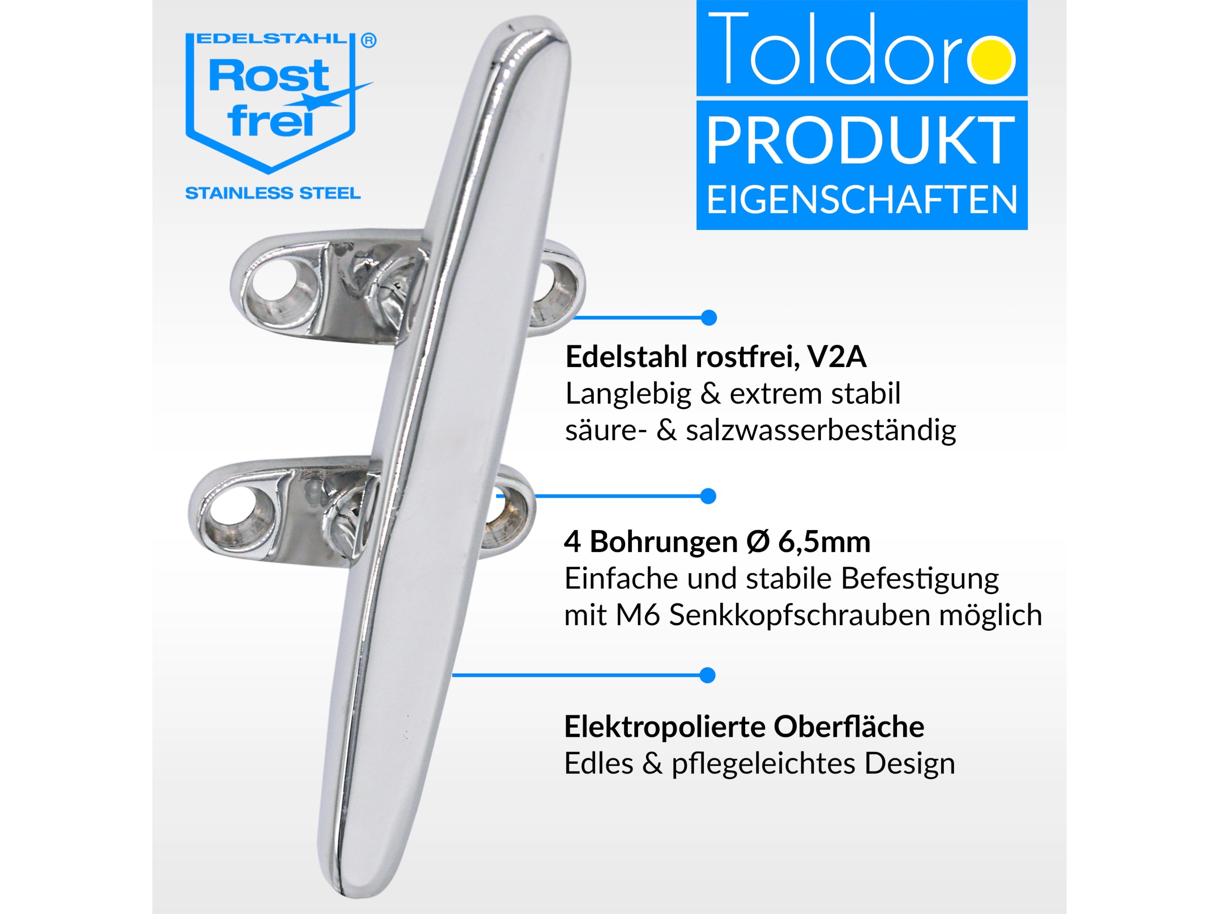 Belegklampe, Klampe, Klampen aus Edelstahl V4A, poliert Klampe Edelstahl V4A 2-Loch Befestigung » Bootsklampe Für Sicheres Festmachen 4 Stück Flaggenklampen aus Edelstahl A4 Länge 150 mm | Durchmesser Bohrung 6,7 mm | Abstand der Bohrungen 24 mm - siehe Skizze Edelstahl V4A poliert, rostfrei und seewasserbeständig 2 Bohrungen zur Befestigung (Schrauben sind nicht im Lieferumfang enthalten) Edelstahl V4A poliert, rostfrei und seewasserbeständig Können versendet werden, Versand zahl der Käufer. Bei Diese Edelstahl-Klampe ist das ideale Zubehör für die Schifffahrt und den Bootsbau. Sie dient als zuverlässiger Ankerpunkt zum Festmachen von Leinen, Taue oder Netzen und hält selbst unter starker Belastung stand 2 Bohrungen zur Befestigung (Schrauben sind nicht im Lieferumfang enthalten) Klampe Festmacher Kunststoff online günstig kaufen