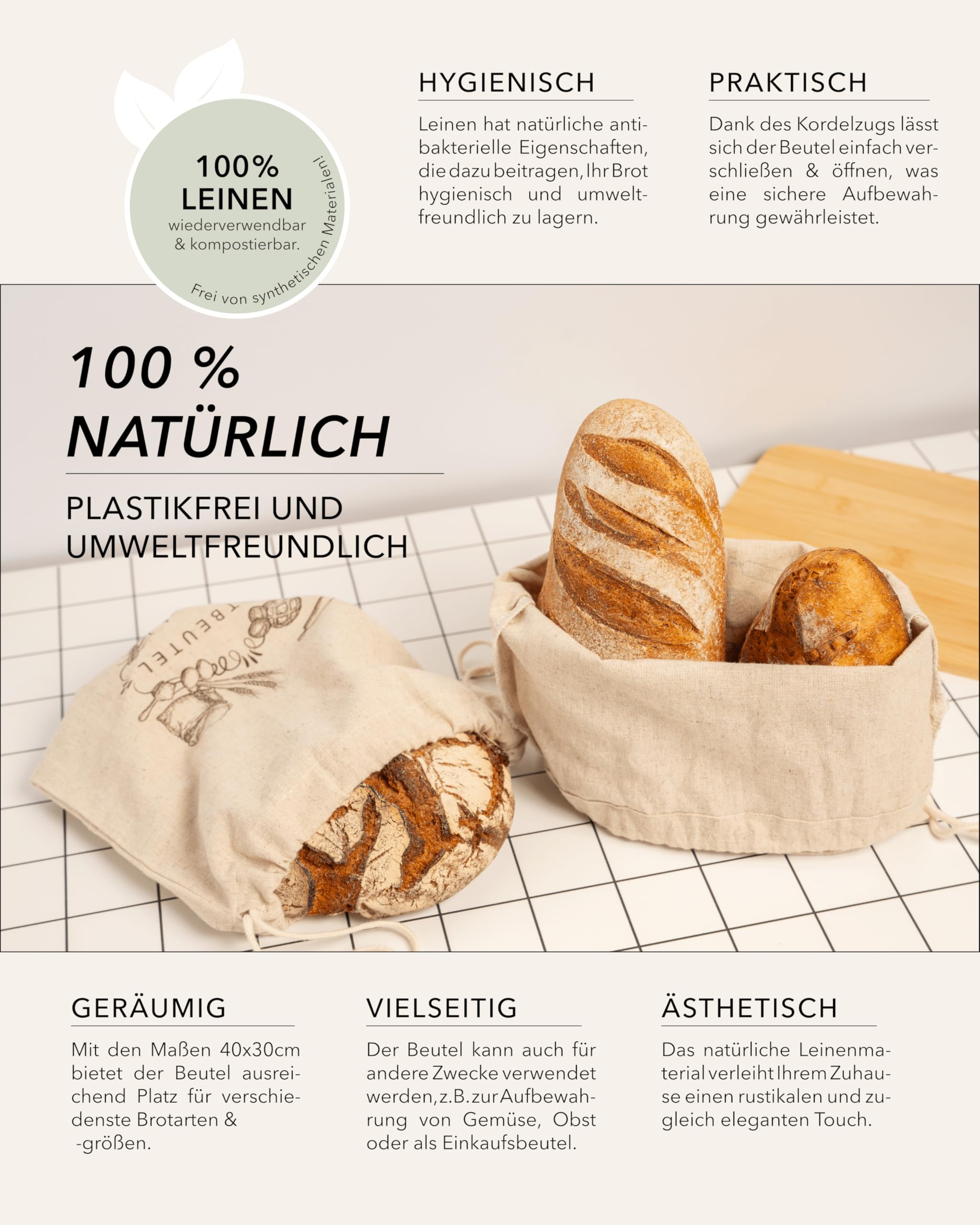 2 Stück Brotbeutel Leinen, Brotsack Zum Frischhalten, Leinen Brotbeutel