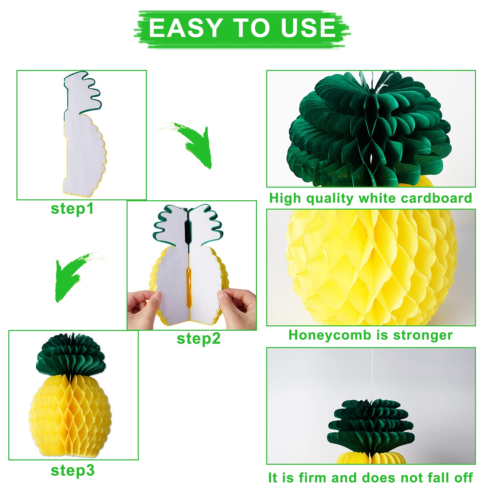 Ideal für alle Anlässe: Geburtstagsfeiern, Heimdekoration, Kinderspiel, Mädchen- oder Jungenzimmer, Hochzeiten, Brautpartys, Weihnachten, Erntedankfest, Vatertag, Muttertag, Kinderzimmer, Festival, Urlaub, Junggesellinnenabschied, Feier oder andere besondere Anlässe. Diese hängenden Papier-Ananas-Waben lassen sich leicht öffnen und fixieren; diese hängenden Papierananas haben eine Schnur zum Aufhängen, einfach ausklappen, um eine schöne hängende Dekoration zu erhalten. Passt gut zu anderen Party-Dekorationen und passt zum Aufhängen an der Decke, Tisch, Wandhintergrund oder Bäumen. Diese hängenden Papier-Ananas-Waben sind leicht zu öffnen und zu fixieren; diese hängenden Papierananas haben eine Schnur zum Aufhängen. Einfach ausklappen, um eine schöne hängende Dekoration zu erhalten. Kann als Tisch- oder Deckendekoration betrachtet werden, um Ihre Aufmerksamkeit zu erregen Papier-Ananas Honeycomb 3fach sort · 24421027 8 Stück 35,6 cm große Papier-Ananas-Waben-Set, schöne, schöne, lebendige Ananas-Wabendekorationen Die Farben sind hell und satt und perfekt aufeinander abgestimmt. Kann als Tisch- oder Deckendekoration betrachtet werden, um Ihre Aufmerksamkeit zu erregen. Hängen Sie nicht dort auf, wo es leicht heruntergezogen werden kann. Warnhinweise Außerhalb der Reichweite von Kindern und Haustieren aufbewahren. Paket enthält 10 Packungen Papier Ananas Waben, jede Ananas misst ca. 35 cm (14 Zoll), grüne und gelbe Farbe bringen Ihnen Natur und fröhliches Gefühl, und das exquisite Aussehen mit hellen Farben, geeignet zum Servieren als Partydekoration Sie können an Decken, Tischen, Wänden, Fenstern, Türen, Bäumen oder Gängen hängen. Farbe: verschiedene Farben wie abgebildet. 【Service】Wir werden uns bemühen, Ihre Probleme zu lösen und unser Bestes zu versuchen, um Ihre Zufriedenheit zu erreichen, kontaktieren Sie uns bitte jederzeit. Deko Ananas 20/30/35cm Papier Ananas Wabe Mittelstücke Taschentuch Tisch Summer Deko 【Service】 Wir werden uns bemühen, Ihre Probleme zu lösen und unser Bestes zu geben, um Ihre Zufriedenheit zu erreichen