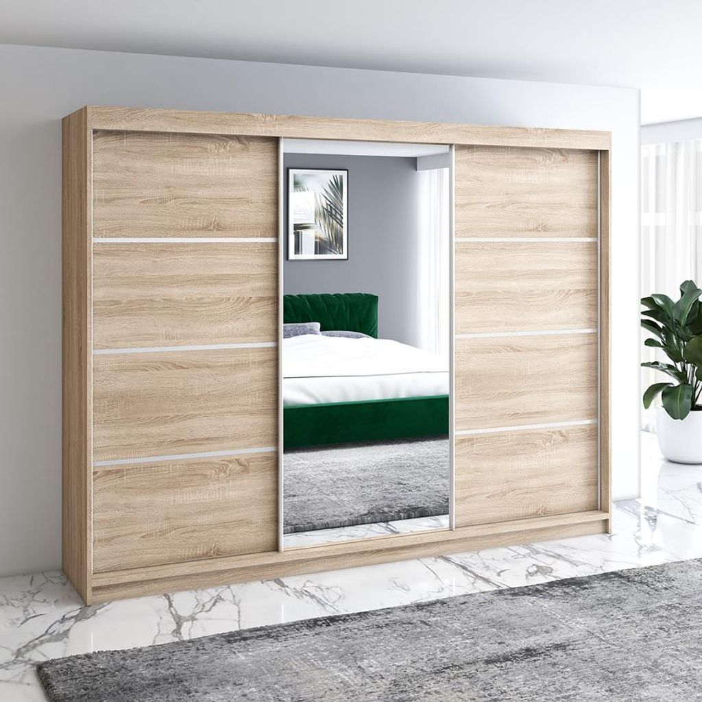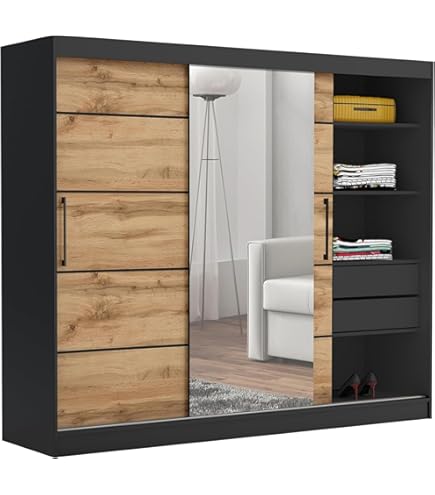 Praktische Griffleisten – Über die gesamte Türhöhe angebracht, erleichtern sie das Öffnen und Schließen des Schranks auf jeder Höhe. Durchdachte Innenaufteilung – Mit 2 Kleiderstangen, 4 großzügigen Schubladen und zahlreichen Regalböden bietet der Schrank maximalen Stauraum. - Korpus und Fronten: 16mm laminierte Platte, feuchtigkeits- und abriebfest - Trennwände und Regale: 16mm laminierte Platte - P Premium-Schiebetürsystem von SEVROLL – Leichtgängige und leise laufende Türen auf stabilen Aluminium-Führungen für höchsten Komfort im Alltag. Robuste Materialien für lange Haltbarkeit – 16 mm starke Laminatplatten mit ABS-Kanten sind kratzfest, pflegeleicht und feuchtigkeitsbeständig. Die 16 mm starken Laminatplatten mit ABS-Kanten sind pflegeleicht, kratzfest und feuchtigkeitsbeständig, wodurch der Schrank eine lange Haltbarkeit garantiert. Die Innenausstattung umfasst zwei stabile Kleiderstangen, vier geräumige Schubladen sowie mehrere Regalböden, die eine übersichtliche Organisation von Kleidung und Accessoires ermöglichen. Modernes Design mit Spiegel – Der große Spiegel sorgt für mehr Helligkeit im Raum und vergrößert diesen optisch. MOEBLO Kleiderschrank ELBA I (Schwebetürenschrank 2-türig Schrank Garderobe Schiebtüren Schlafzimmer, mit Spiegel Kleiderstange und Regale) (BxHxT):250x218x61 cm, Einfaches, minimalistisches Design im modernen Stil Mit geräumigen Schubladen, Kleiderstangen und zahlreichen Regalen bietet er außergewöhnlich viel Stauraum. Der Schrank ist in verschiedenen Varianten erhältlich, die sich ideal in jedes Interieur einfügen, vom Schlafzimmer über Jugendzimmer bis hin zu Büros oder Hotelzimmern Linea Natura SCHWEBETÜRENSCHRANK in Dunkelbraun, Eiche Bianco online kaufen ➤ XX Der Schwebetürenschrank VILANO 4 überzeugt durch modernes Design, eine funktionale Innenaufteilung und hochwertige Materialien. Mit 200 cm Breite und 215 cm Höhe bietet er großzügigen Stauraum und passt perfekt ins Schlaf-, Gäste- oder Ankleidezimmer Eine gedruckte Montageanleitung ist im Lieferumfang enthalten – zusätzlich finden Sie darin einen QR-Code mit direktem Link zu einem anschaulichen Video-Tutorial, das alle Montageschritte Schritt für Schritt erklärt. Kleiderschrank mit Regalen) Breite: 120 cm, 160 cm, 180 cm, Höhe: 215 cm, Tiefe: 59 Auch optisch überzeugt VILANO: Das zeitlose Design mit großem Spiegel bringt mehr Licht in den Raum und lässt ihn großzügiger wirken.