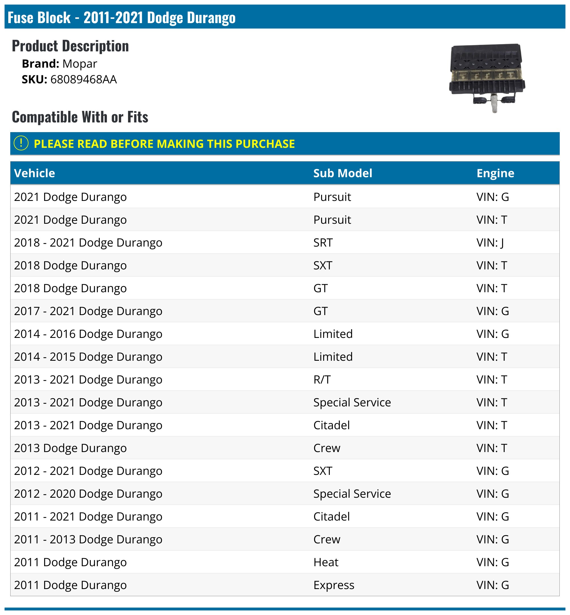 2011-2023 Mopar Fuse Block 68089468AA | Mopar Es
