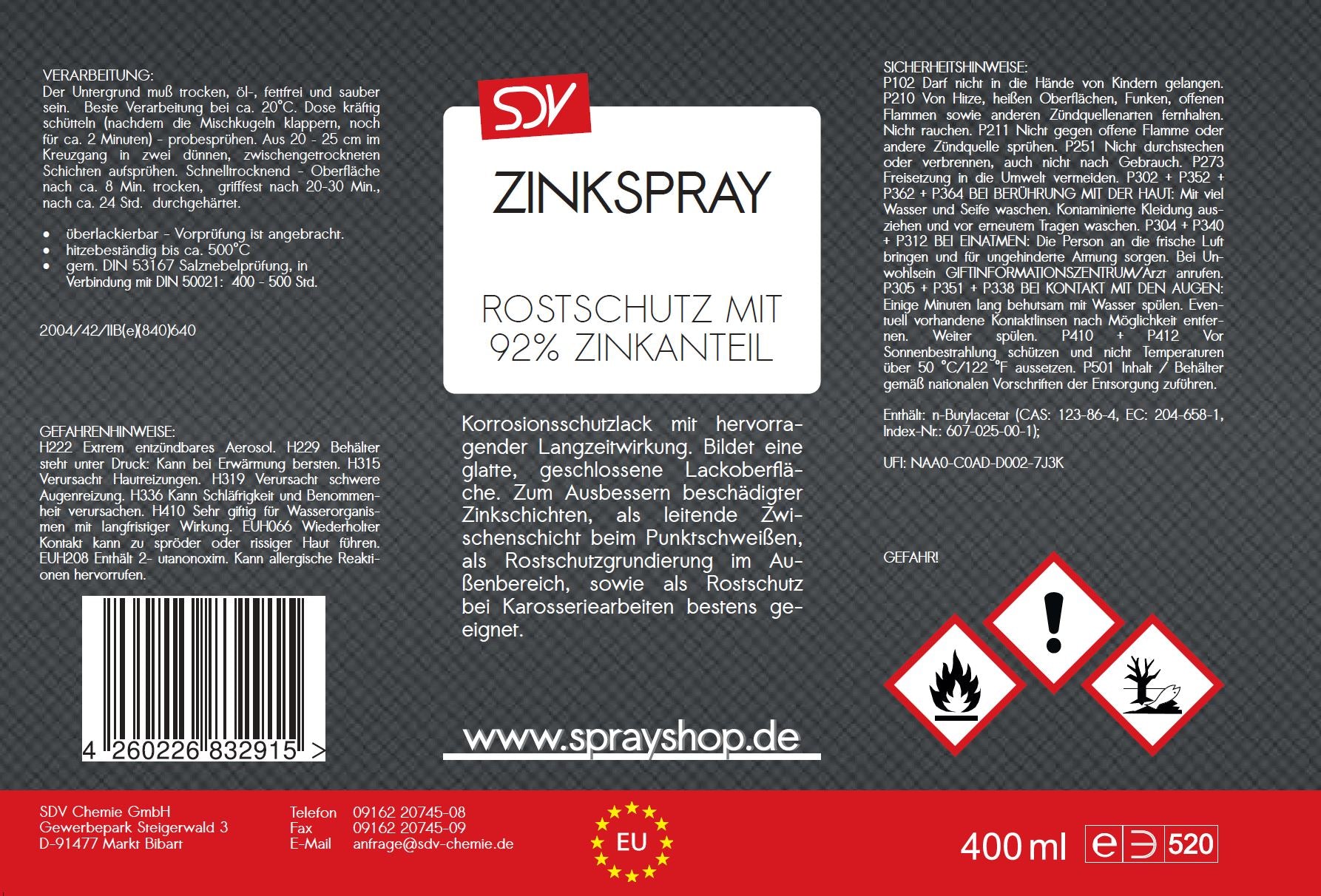 AGT Zinkspray: Zink-Aluminium-Spray, 400 ml (Zinkspray gegen Rost feuerverzinkten Teilen, kathodischen Korrosionsschutz. SDV Chemie ZINKSPRAY ist eine Zinkstaub-Korrosionsschutzgrundierung mit hervorragender Langzeitwirkung auf der Basis ausgewählter Bindemittel. SDV Chemie ZINKSPRAY verleiht dauerhaft allen Oberflächen aus Metall, wie z.B. Produktbeschreibungen SDV Chemie ZINKSPRAY ist eine Zinkstaub-Korrosionsschutzgrundierung mit hervorragender Langzeitwirkung auf der Basis ausgewählter Bindemittel. Temperaturbeständigkeit bis +450°C Dose nach Gebrauch über Kopf frei sprühen bis Treibgas entweicht., Handtrocken nach ca., 5 Min. Salzsprühbeständigkeit nach DIN 50021SS Gitterschnitt: GT 0 - 1 Temperaturbeständigkeit bis +450°C Farbe:Rot SDV Chemie ZINKSPRAY bildet eine äußerst widerstandsfähige Schutzschicht auch gegen extreme Witterungs- und Umwelteinflüsse. SDV Chemie ZINKSPRAY ist eine Zinkstaub-Korrosionsschutzgrundierung mit hervorragender Langzeitwirkung auf der Basis ausgewählter Bindemittel. SDV Chemie ZINKSPRAY verleiht dauerhaft allen Oberflächen aus Metall, wie z.B. feuerverzinkten Teilen, kathodischen Korrosionsschutz SDV Chemie ZINKSPRAY verleiht dauerhaft allen Oberflächen aus Metall, wie z., B. Fahrzeugteile Hoffann 3 Stück DC ZINC Prier 400l 97% bis 300°C... SDV Chemie ZINKSPRAY hat einen sehr hohen metallischen Zinkanteil. Salzsprühbeständigkeit nach DIN 50021SS , Gitterschnitt: GT 0 - 1 Überlackierbar und schweißbar nach ca., 3 Stunden. Es bildet eine schnelltrocknende, festhaftende Schutzschicht aus mikrofeinen Zinkteilchen. Zinkspray Temperaturbeständig Zinkspray Hell 24 X 400 Ml Grundierung Rostschutz Zink Spray
