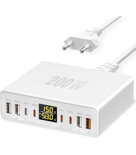 【Effizient & Sicher】Unser Charging Station nutzt fortschrittliche Galliumnitrid-Chips (GaN-III) und bietet umfassenden Schutz durch Sicherheitsmechanismen wie Überspannungsschutz, Überstromschutz, Übertemperaturschutz und Kurzschlussschutz – für maximale Sicherheit Ihrer Geräte und während des Ladevorgangs. UOUCOO 200W USB C Ladegerät GAN Charger Mehrfach,100W+100W 4 Port Es lädt gleichzeitig bis zu 6 Geräte schnell auf, wobei jeder Port intelligent mit Strom versorgt wird, um optimale Ladeeffizienz zu gewährleisten! 【Universelle Kompatibilität】Diese USB Ladestation ist mit gängigen digitalen Geräten kompatibel – unterstützt USB-C-Laptops wie MacBook Pro/Air, Microsoft Surface, ThinkPad und Lenovo Yoga; lädt Smartphones inklusive iPhone 16/15/14/13/12 Pro Max/SE (2020)/8/7/6/6s sowie Galaxy S24/S23/S22; und versorgt darüber hinaus alle weiteren per USB-C/USB-A ladbaren Geräte wie AirPods Pro, Game-Controller, Smartwatches und mehr. Passt ideal zu einem kleinen Schreibtisch, auf den Nachttisch oder in die Tasche für unterwegs! 10,92 cm) – verfügt aber über die starke Leistung, gleichzeitig bis zu 6 Geräte aufzuladen. Auf Lager: 240 W USB C Ladegerät mit 6 Anschlüssen, GaN 3 USB Multi Schnellladegerät mit 4 USB C und 2 USB A Anschlüssen, PD140W, 65W, 60W Power Delivery USB C Ladestation für MacBook Pro/Air, iPhone, iPad zum besten Preis, HD183 1206174. Eine schnelle Lieferung überall in Deutschland möglich Usb-c Ladegerät 240W USB C Ladegerät Mehrfachusb, 6 Ports Schnellladegerät, Gan Power Ugreen Netzteil 【Kompakt und Leicht】 Im Vergleich zu anderen klobigen Ladestationen misst der USB Ladestation nur 2,7 Zoll (ca. Es lädt gleichzeitig bis zu 6 Geräte schnell auf, wobei jeder Port intelligent mit Strom versorgt wird, um optimale Ladeeffizienz zu gewährleisten
