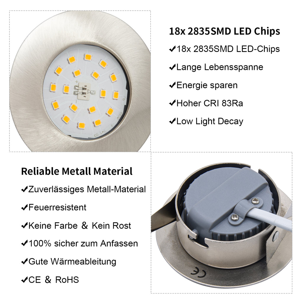 EINFACHE INSTALLATION - Jeder LED Einbauspot kann einzeln im Handumdrehen installiert werden. LED Strhaler eignen sich ideal zum Einbau im Badezimmer, Küche, Sauna, Dusche oder auf der Terrasse. Die MR16 Fassung besteht aus Keramik und bringt die notwendige Stabilität mit sich. Der LED Einbaustrahler hat die Schutzklasse IP44., Der Rahmen des Strahlers besteht aus hochwertigem Aluminium und bleibt für immer rostfrei. Led Einbauspots Eckig LED Einbaustrahler Schwarz - Eckig 3W Kaltweiß 12V MR11 - IP44 Für Bad Badezimmerleuchte Decke Schnelle und einfache Montage machen diesen LED Einbauspot zudem sehr benutzerfreundlich. Material: Aluminium, Keramik, Kunststoff, Farbe: Chrom, Form: Quadratisch, Abmessungen: 55x55mm, Einbautiefe: 50mm, Bohrloch: 40mm, Abstrahlwinkel: 38°, Anlaufzeit: 1s, Schutzklasse: IP44, Spannung: 12 Volt HOCHWERTIGE VERARBEITUNG - Alle LED Spots haben einen Einbaurahmen aus hochwertigem und rostfreiem Aluminium. TRANGO LED Einbaustrahler, Dimmfunktion, 6er Set 6729-068SMOSD LED Einbaustrahler Chrom-Optik Eckig inkl. 6x 5 Watt 3 Stufen dimmbar Ultra Flach LED Modul 3000K warmweiß, Deckenspot, Einbauspot, Decke Netzgerät 230V AC zu 12V DC, Lampendurchmesser: 35mm, Lebensdauer: 30000h TECHNISCHE DATEN - LED Einbaustrahler, 6er Set | Farbe: Chrom| 3W | Lichtfarbe: warmweiß | dimmbar: nein | Leuchtmittel: MR11 LED | Fassung: MR11 Keramikfassung | Material: Aluminium, Keramik, Kunststoff | Abmessungen: 55x55mm | Bohrloch: 40mm | Einbautiefe: 50mm | Lebensdauer: 30000h | Betriebsspannung: 12V | Form: quadratisch | Schutzklasse: IP44 | Abstrahlwinkel: 38° | Anlaufzeit: <1s | Netzteil enthalten: ja Das 3 Watt LED Leuchtmittel besteht aus Kunststoff, hat einen Abstrahlwinkel von 38° und erzeugt angenehmes helles Licht. Das LED Leuchtmittel besteht aus Kunststoff und leuchtet angenehm hell. LED Einbaustrahler Eckig, 6500K, 3W - Onlineshop SICHER UND BENUTZERFREUNDLICH - Der Rahmen des LED Strahlers verfügt über mehrere Dichtungen, welche den Einbaustrahler gegen Feuchtigkeit und Staub schützen. Drei Dichtungen im Inneren des Rahmens schützen den LED Strahler vom Eindringen von Staub und Feuchtigkeit. LED Einbaustrahler 12V 3W MR11 warmweiss Eckig weiss Während der Installation muss der LED Strahler an eine 12 Volt Stromquelle angeschlossen werden. Der LED Einbauspot wird einfach im zuvor vorbereiteten Bohrloch (40mm) angebracht und mittels Federklemmen dort befestigt. Leuchtmittel: 1x MR11 3W LED, Montageart: Federklemmen