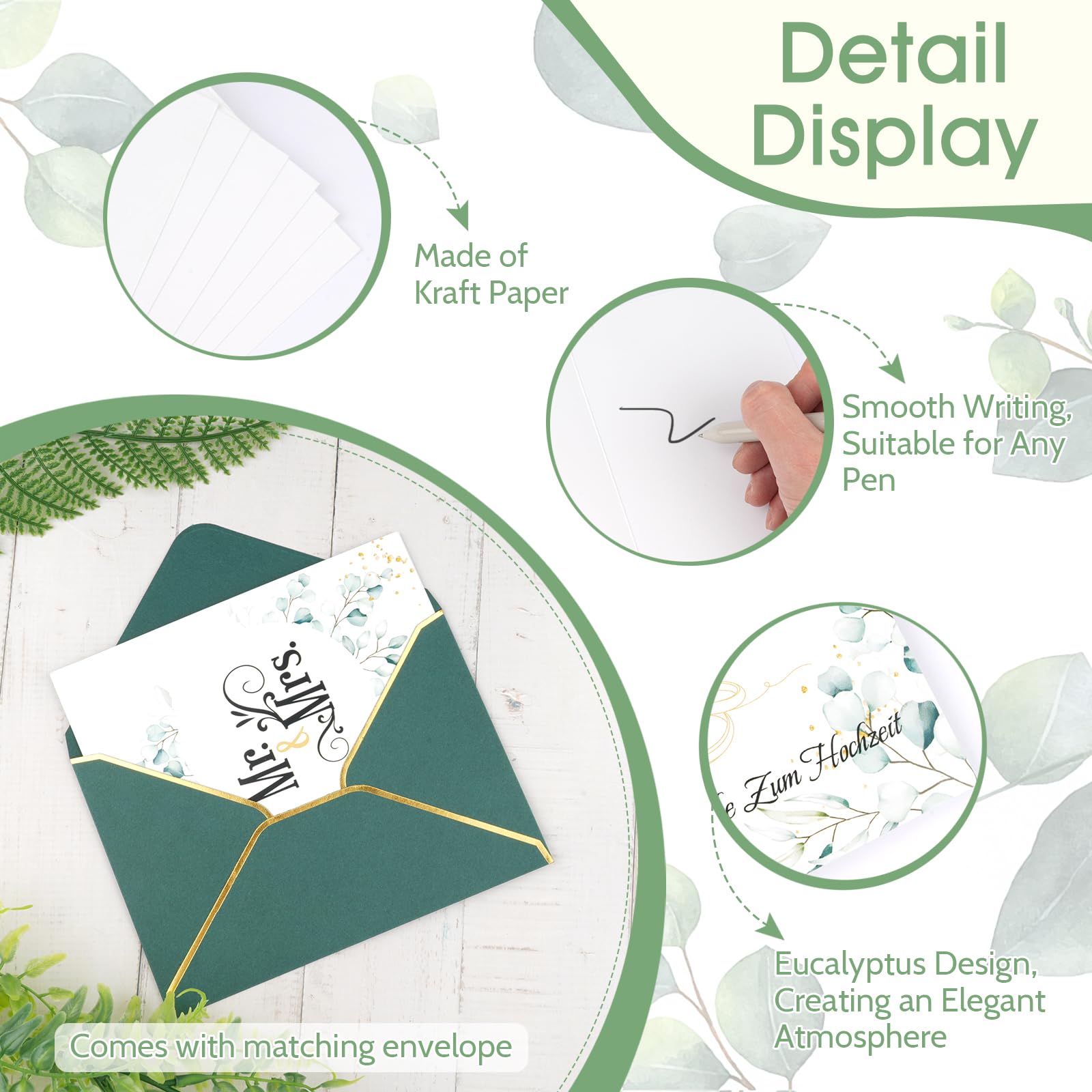 🎁PERFEKTES GESCHENK – Ideal als ungewöhnliches Geschenk für Frischvermählte, das dem Brautpaar ein Erinnerungsgeschenk hinterlässt. Hochzeitskarte Die Klappkarten sind mit den Sprüchen, Mr., & Mrs. Schön, DASS Du da bist! HOCHZEITSKARTE GLÜCKWUNSCHKARTE KARTE zur Hochzeit A4 Umschlag Eukalyptus edel - EUR 12,99.ZU VERKAUFEN! Mit dieser extra großen Hochzeitskarte im DIN A4 Format zeigst du auf ganz besondere Weise deine Wertschätzung. Ob für Freunde, Familie oder Kolleg:innen - diese hochwertige Klappkarte zur Hochzeit bietet viel Raum für persönliche Glückwünsche, Unterschriften, Zitate oder kleine Zeichnungen ✍️ HIGH QUALITÄT: Unsere Hochzeitskarten werden auf hochwertigem 300g/m Naturkarton bedruckt. Die Karten werden nach links aufgeklappt, das mit allen Stiften (wie Füllfederhalter, Filzstifte, Füllfederhalter, Buntstifte., ., ., ) Schön, DASS Du da bist! 🤵👰 KOMPLETT-SET: Unser Hochzeitskarten Set besteht aus 4 liebevoll gestalteten Klappkarten im Format A6 (105 x 148 mm) und 4 dazu passende Briefumschläge. Diese Begrüßung ist nicht nur höflich, sondern drückt auch echte Gefühle aus, die den Gästen das Gefühl vermitteln, geschätzt und willkommen zu sein. Glückwunschkarte Hochzeit Hochzeit Glückwunschkarten 3er Set, Mit Blumenkranz Motiv, Grußkarten Karte Zur Hochzeit 🤵👰 HOCHZEITSGLÜCKWÜNSCHE: Die Klappkarten sind mit den Sprüchen, Mr., & Mrs. Jede Karte ist wie ein kleines Kunstwerk, das die Gäste dazu einlädt, sich an Ihrem besonderen Tag willkommen und geschätzt zu fühlen. Diese Worte zeigen Dankbarkeit für die Unterstützung und Begleitung in wichtigen Momenten. Marvelights Hochzeitskarte 4er Set Eukalyptus, Glückwunschkarte Hochzeit, Grußkarten Hochzeit, Klappkarten Hochzeitskarten A6 mit Umschläge. Mit liebevoll gestalteten Tischkarten können Sie nicht nur die Sitzordnung organisieren, sondern auch Ihre Hochzeitstafel elegant und individuell gestalten Hochzeitskarte für hoosexuelle 2023 - Ikauder
