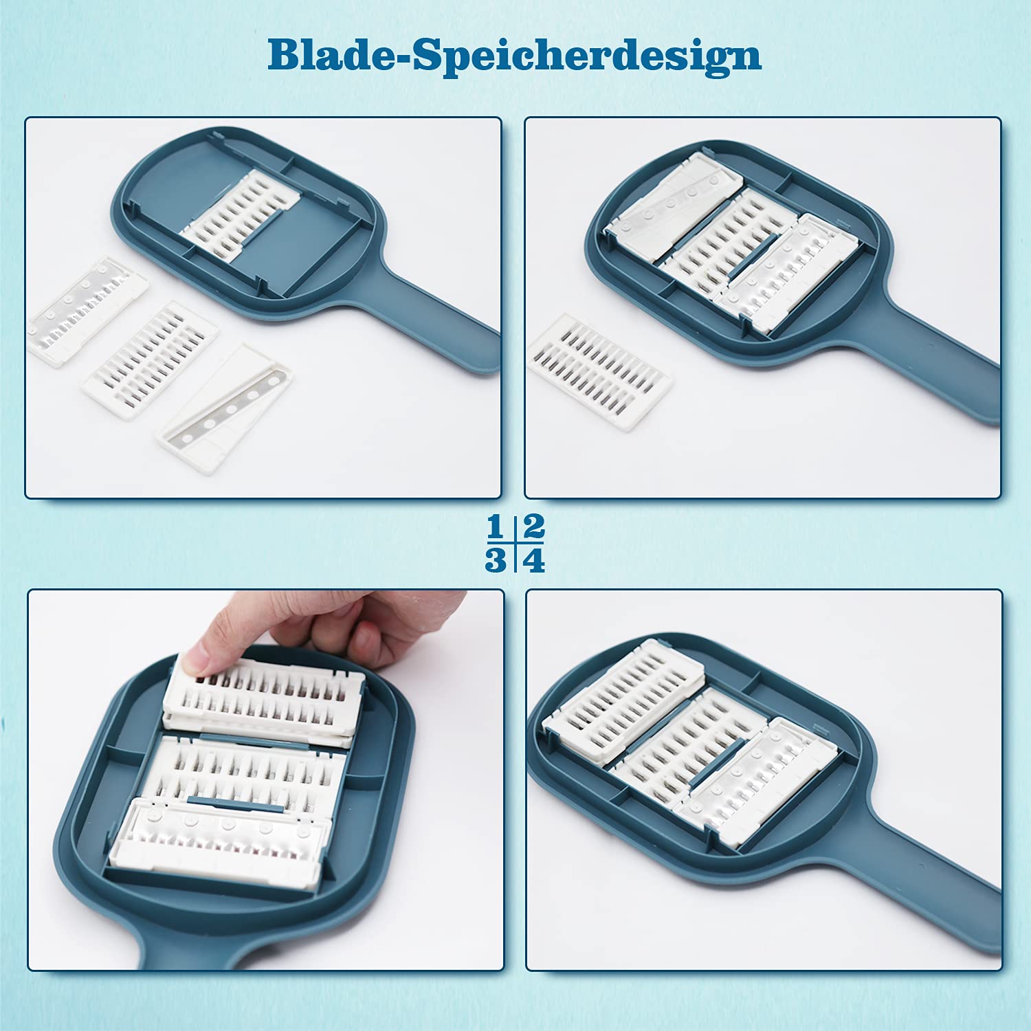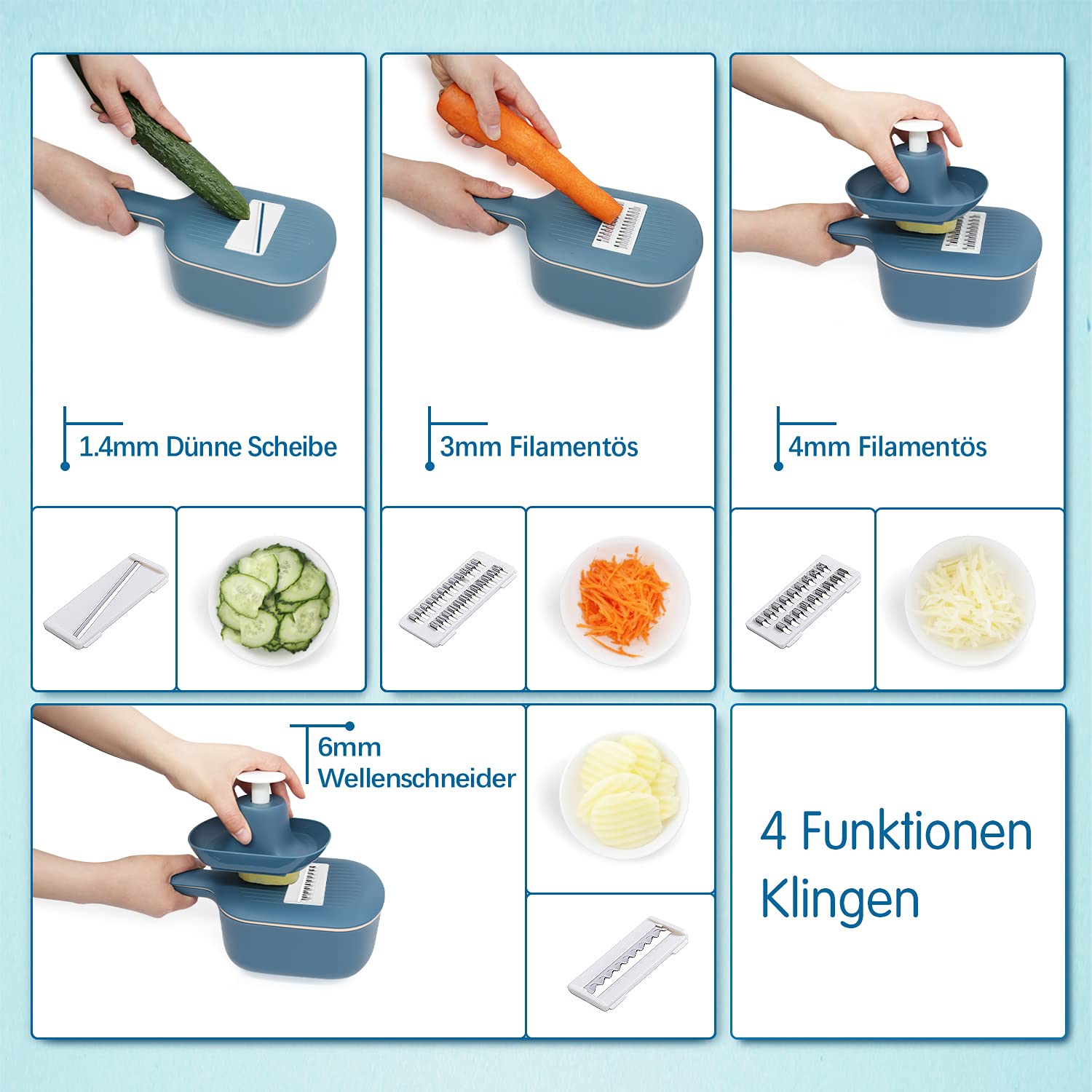 Die vier auswechselbaren Messereinsätze lassen sich schnell und einfach unter lauwarmem Wasser von Speiseresten befreien. Der Glasbehälter fängt das geschnittene Obst und Gemüse auf und kann zudem als Behälter für warme und kalte, feste und flüssige Speisen verwendet werden. Top 5 Rettichschneider (Test ≈ Ratgeber) | Wie den Rettich schneiden Selbst bei intensiver Nutzung ist derObst- und Gemüsehacker ein hochwertigen Begleiter. Bei der Auswahl seiner Messer legt Steffen besonders viel Wert auf eine professionelle Verarbeitung. Der Gemüsehobel von HENSSLERS ist ein echtes Multitalent, das als Gemüsehobel, Kartoffelreibe, Obst- und Kartoffelschneider eingesetzt werden kann. Dank des hochwertigen und messerscharfen Edelstahls und der vier auswechselbaren Messereinsätze ist der Gemüsehobel in jeder Küche unverzichtbar 4-fach Hobel mit 5 zusätzlichen Reibe- und Schneideeinsätzen) günstig kaufen bei Im Gegensatz zu herkömmlichen Zerkleinerern aus Kunststoff setzt Steffens Schneider mit seinem hohen Anteil an Bambusholz auf eine natürliche Ausrichtung. Nicer Dicer Chef Zggzerg Gemüsehobel 4-setge Rebe Edelstahl, Küchenrebe Zum Groben Und Feinem Raspeln Hensslers Gemüsehobel Material – Die 4 Schneide-Aufsätze der Küchenreibe sind aus scharfem und rostfreiem Edelstahl gefertigt. Der Deckel aus Bambus und die Glasschüssel bietet eine natürliche Alternative zu Plastik. Der Schneidguthalter hilft, Obst und Gemüse bis zum letzten Rest zu verarbeiten und schützt gleichzeitig die Hände. Ergonomisch – Trotz seiner kompakten Größe bietet die Gemüsereibe eine große Arbeitsfläche. Pflege – Reste lassen sich schnell und einfach von der Schneidehilfe herunterspülen. Selbst hartnäckige Verschmutzungen lassen sich so mühelos und hygienisch entfernen, sodass der Schneider stets sauber und keimfrei bleibt. Reixuier GeüSeschneider GeüSehobel GeüSe Schneider - 9 in 1... Zudem unterstützt der Multizerkleinerer dabei, Obst und Gemüse bis zum letzten Rest zu verwerten. Ergonomisch geformt Ergonomie steht bei den Küchenprodukten von HENSSLERS immer im Mittelpunkt, denn ergonomisch geformte Küchenhelfer erhalten den Spaß am Kochen und sparen wertvolle Zeit. Praktisch Der Obst- und Gemüseschneider ist nicht nur besonders kompakt, sondern auch besonders leicht zu reinigen.