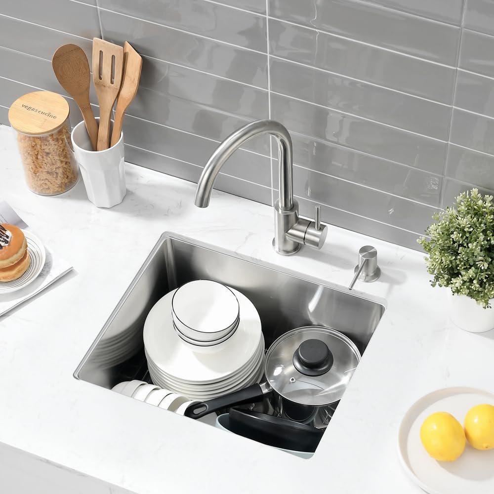 [Inklusive] Wet Bar Spüle und Ablaufmontage mit Sieb, Einzelbecken Waschbecken ist leicht zu reinigen und langlebig, passt zu den meisten Küchengeräten. [Hochwertiges Material] Jshozzy Edelstahl Küchenspüle aus hochwertigem 16 dickem SUS304 Edelstahl, stark und langlebig. Kitchen Sink Cecipa Spülen Mit 50 X 45 X 18,5 Cm - Küchenspüle Ohne Seifenspender - Quadratische Küchenspüle, Edelstahl Gebürstet 1 Becken Dicke: 16 Gauge Spülenlänge 45,7 cm Spülenbreite 38,1 cm Spülentiefe 25,4 cm Größe des Ablauflochs: 8,9 cm. Minimale Schrankgröße 21 Im Lieferumfang enthalten: Edelstahl-Küchenspüle, 8,9 cm Standard-Korbsieb-Ablaufmontage, unteres Spülgitter, Ausschnittschablone (Installationsanleitung) und Befestigungsclips. X-förmige Umleitungslinie auf der sanft abgeschrägten Unterseite, erhöht nicht nur die Design-Ästhetik, sondern leitet auch Wasser schnell und vollständig ab, keine Verstopfung. Diese Bar-Vorbereitungsspüle funktioniert perfekt gegen physische Kratzer, Rostschutz, Wasserspuren und Fleckenresistenz. Handgefertigte Küchenspüle in handelsüblicher Qualität ist kratzfest, hitzebeständig, rostbeständig. Minimale Schrankgröße 53,3 cm. Maße der Spüle: Außenmaße: 45,7 cm (L) x 38,1 cm (B) x 25,4 cm (T). Schnelle Entwässerung: Unterbau-Barwaschbecken mit X-Kanal-Rillen für besseres und schnelles Entwässerungsdesign, R10-Winkel bietet viel Komfort für Reinigungsaufgaben. Auralum Küchenspüle 44 x 49 CM Edelstahl Spülenoberfläche: gebürstetes Nickel. Reginox Ohio Küchenspüle edelstahl seidenglanz - R15957 | REUTER Die Ablaufgarnitur wird mit einem Korbsieb geliefert, das als Lebensmittelabfallsammler fungiert.