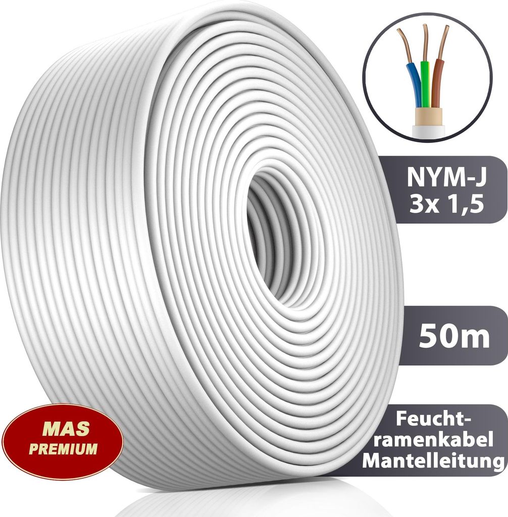 ✔️ MAS Premium: Wir von MAS-Premium stehen für höchste Qualitätsstandards. ✔️ PRAKTISCHE FARBE: Der Feuchtraumkabel ist durch den PVC-Mantel in grau sowie der gut erkennbaren und branchenübliche Aderfarben. MAS Premium Feuchtraumkabel Stromkabel von 5m bis 50m Mantelleitung NYM-J 5x6 mm² Elektrokabel Ring für feste Verlegung (30m ✔️ STANDARD NYM-J Feuchtraumkabel Mantelleitung NYM-J Strom-kabel. Nennspannung 300/500 Volt Prüfwechselspannung = 2000 Volt und entspricht dadurch den Standards in der Branche. Auch verwendbar im Freien, sofern Schutz vor direkter Sonneneinstrahlung gewährleistet ist. 5m, 10m, 15m, 20m, 25m, 30m, 35m, 40m oder 50m Feuchtraumkabel NYM-J 5x6,0 mm² Mantelleitung Elektro Strom Kabel OFC MADE IN GERMANY Als Installationsleitung, zur Verlegung auf, in und unter Putz, in trockenen, feuchten und nassen Räumen, sowie im Mauerwerk und im Beton. blau, braun, schwarz, weiß, grüngelb. Feuchtraumkabel / Feuchtraumleitung. Bei Verwendung im Freien (nicht im Erdreich) muss das Kabel vor UV Strahlung geschützt werden. Schraubautomat Schraubsicherung L 16A 10A Sicherungsautomat Sicherung E27 230VEUR 5,49-6,29 Mantelleitung NYM-J 5X6 mm 30M | Preisvergleich bei Die Hersteller können sich unterscheiden. Nym 3x1,5 Feuchtraukabel Strokabel Von 5 Bis 50 Antelleitung NY-J 5x6 ² Elektrokabel Ring Für 5x6mm2 Feuchtraumkabel Technische Daten - Produktart: Strom Kabel NYM-J 5x6,0 mm²- Herkunftsland: Deutschland, Made in Germany- Spannung: Nennspannung 300/500 V, Prüfspannung 2000V- Innenleiter: Kupfer eindrähtig, Klasse 1 nach DIN VDE 0295- Isolation: PVC-Mischung YI1 nach DIN VDE 0207 Teil 4- Farbe: grau- Mantel: Mischung YM1 nach VDE 0207 Teil 5- Außendurchmesser: ca. Schraubautomat Schraubsicherung L 16A 10A Sicherungsautomat Sicherung E27 230VEUR 5,49-6,29. Das Produkt ist konform zur 2006/95/EG-Richtlinie (Niederspannungsrichtlinie).