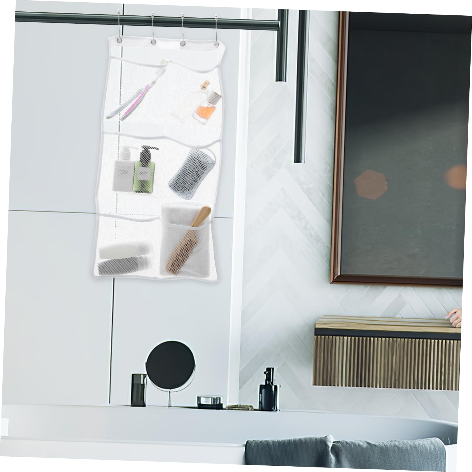Ideal für Reisen und Kreuzfahrt: Ein Muss für Kreuzfahrtschiffe, Schlafsäle oder jede gemeinsame Badezimmersituation, damit Sie Ihre persönlichen Gegenstände organisiert und hygienisch aufbewahren können Hängender Duschkorb aus Stahl mit Haken kaufen Geräumige Taschen für Organisation: Der Dusch-Organizer zum Aufhängen misst 67 cm x 43 cm, verfügt über mehrere Taschen für Seife, Shampoo, Rasierer und andere Badezimmerutensilien, hält alles organisiert und in Reichweite. Schnell trocknendes Netzmaterial: Hergestellt aus 100 % reißfestem Polyester-Netzgewebe, verbessert und verstärkt. Lässt sich leicht an Haken, Stangen oder Duschköpfen hängen, bietet bequemen Zugang zu Ihren Gegenständen und maximiert gleichzeitig den Stauraum in kleinen Räumen Tragbar und platzsparend: Das leichte und kompakte Design macht es einfach zu tragen, perfekt für Badezimmer mit begrenztem Platz oder für Reisen, Schlafsäle und Kreuzfahrten. Reise-Kulturbeutel für Herren – Outdoor-Reise-Organizer mit großem Fassungsvermögen für Damenkosmetik – multifunktionale Aufbewahrungstasche für Toilettenartikel Wasserdichter Hängender Duschkorb-Organizer Mit 7 Flexiblen Haltern Schnell Trocknender Kulturbeutel Aus Netzmaterial Mit Beruehrungsfreundlicher Tas P9974632 Entworfen mit atmungsaktivem Netz, das Wasser leicht abfließen lässt, um sicherzustellen, dass Ihre Duschutensilien schnell trocknen und sauber bleiben. Dauerhaft: Der tragbare Netz-Duschkorb ist aus robustem und langlebigem Polyester gefertigt.. Die Duschtasche fasst viele Toilettenartikel und reißt nicht, und das Netz ermöglicht eine schnelle Wasserfiltration und kann die Tasche aufrecht halten