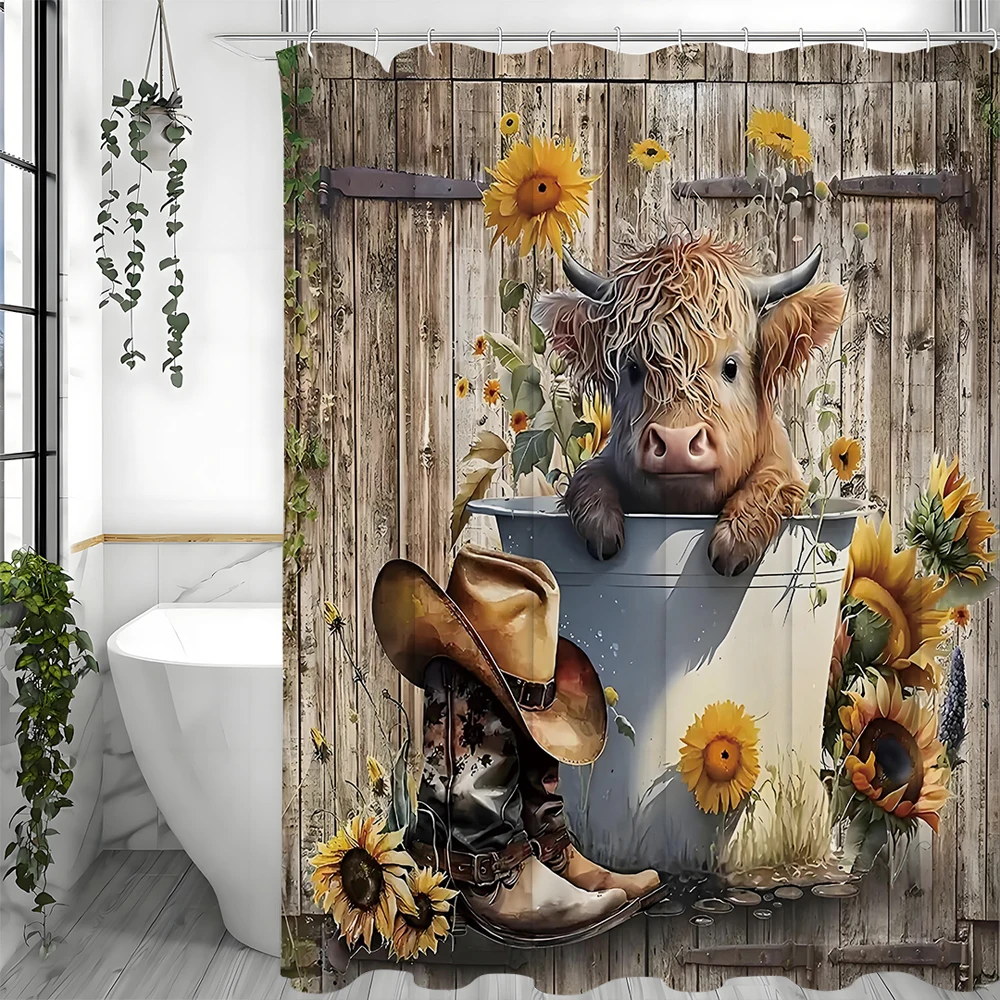 Glawry Duschvorhang, Motiv: Hochlandkuh, Sonnenblume, 152,4 X 183,9 Cm (B X L), Lustig, Western-Land, Retro, Get Naked Bull Cattle Farmhouse, Badezimmerdekoration, Badzubehör, Kunst, Heimdekoration