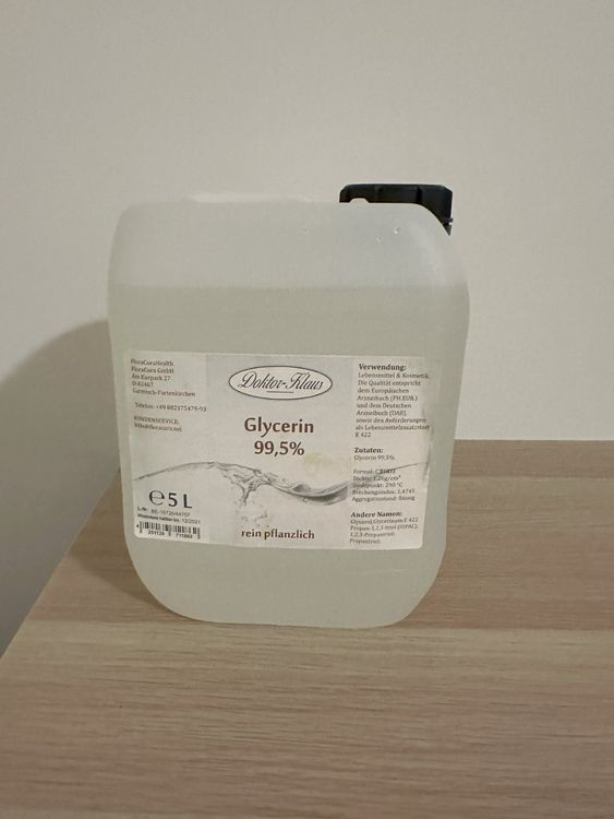 Details Produktbeschreibung Als Lebensmittelzusatzstoff findet Glycerin unter der Nummer E 422 Anwendung zur Feuchthaltung, etwa für Datteln oder Kaugummi, aber auch als Süßungsmittel. Auch in verschiedenen Zahnpasten ist Glycerin enthalten. Eigenschaften: - 99,5% rein - vegan - Pharma Qualität - Lebensmittel - Pflanzlich - leicht... 500 ml (VG) Vegan Glycerin + 500 ml (PG) Propylen 99,5% Rein in Glycerin in der Hautpflege Glycerin ist ein beliebter Bestandteil in vielen Hautpflegeprodukten wie Cremes, Lotionen, Seifen und Shampoos. Alltäglicher Gebrauch von Glycerin Die feuchtigkeitsbindenden Eigenschaften des Glycerins wirken sich positiv auf die Geschmeidigkeit von Gummi aus. Dies ist besonders vorteilhaft für verschiedene Anwendungen, wie beispielsweise Dichtungen an Fahrzeugtüren, Kühlschränken oder Booten. Es verbessert die Pflegewirkung und fördert eine weiche, geschmeidige Haut. Glycerin E422 Glycerin 99,5 % Für Technische Anwendungen GmbH Glycerin Kaufen Darüber hinaus bewirkt eine geringfügige Zugabe von Glycerin eine Steigerung der Stabilität von Seifenblasen. Glycerin in der Haarpflege Feuchtigkeitsretention: Durch die Bildung eines feuchtigkeitsbindenden Films auf der Haaroberfläche hilft Glycerin dabei, die Feuchtigkeit im Haar einzuschließen. Eur I USP I Vegan I Kosher I GVO-frei I Pharma-Zentralnummer (PZN) 19134275 Dieses erstklassige Produkt ist eine essentielle Ergänzung für Ihre Hautpflege- und Wellness-Routine. Es besitzt feuchtigkeitsspendende Eigenschaften, die dazu beitragen, die Haut mit Feuchtigkeit zu versorgen und ihre Geschmeidigkeit zu erhalten. Dies macht es zur idealen Wahl für alle, die Wert auf vegane und nachhaltige Produkte legen. Entdecken Sie die vielseitigen Anwendungsmöglichkeiten von unserem hochwertigen pflanzlichen Glycerin mit einem Reinheitsgrad von 99,5%. Da Glycerin bei Temperaturen von bis zu -18 °C gefriert, lässt sich der Gefrierpunkt des Scheibenwaschwassers durch gezieltes Mischen deutlich absenken. 🍽️ Lebensmittelindustrie: In der Lebensmittelindustrie dient Glycerin als Lebensmittelzusatzstoff und Feuchthaltemittel. Beachte jedoch, dass einige Personen empfindlich auf Glycerin reagieren können, daher ist es ratsam, vorher einen Hauttest durchzuführen. Rein pflanzliches Glycerin: Unser Glycerin wird aus pflanzlichen Quellen gewonnen und ist frei von tierischen Bestandteilen. Glycerin rein pflanzlich 99,5% r. (500 ml), 4,95 I Lebensmittelzertifizierung: PET-Flasche/braun, KSV-OV. Hergestellt aus rein pflanzlichen Quellen, garantiert es Ihnen eine natürliche und nachhaltige Pflege, die Ihre Erwartungen übertreffen wird. 🌍 Umweltfreundlich: 100% rein und natürlich, vegan und tierversuchsfrei.