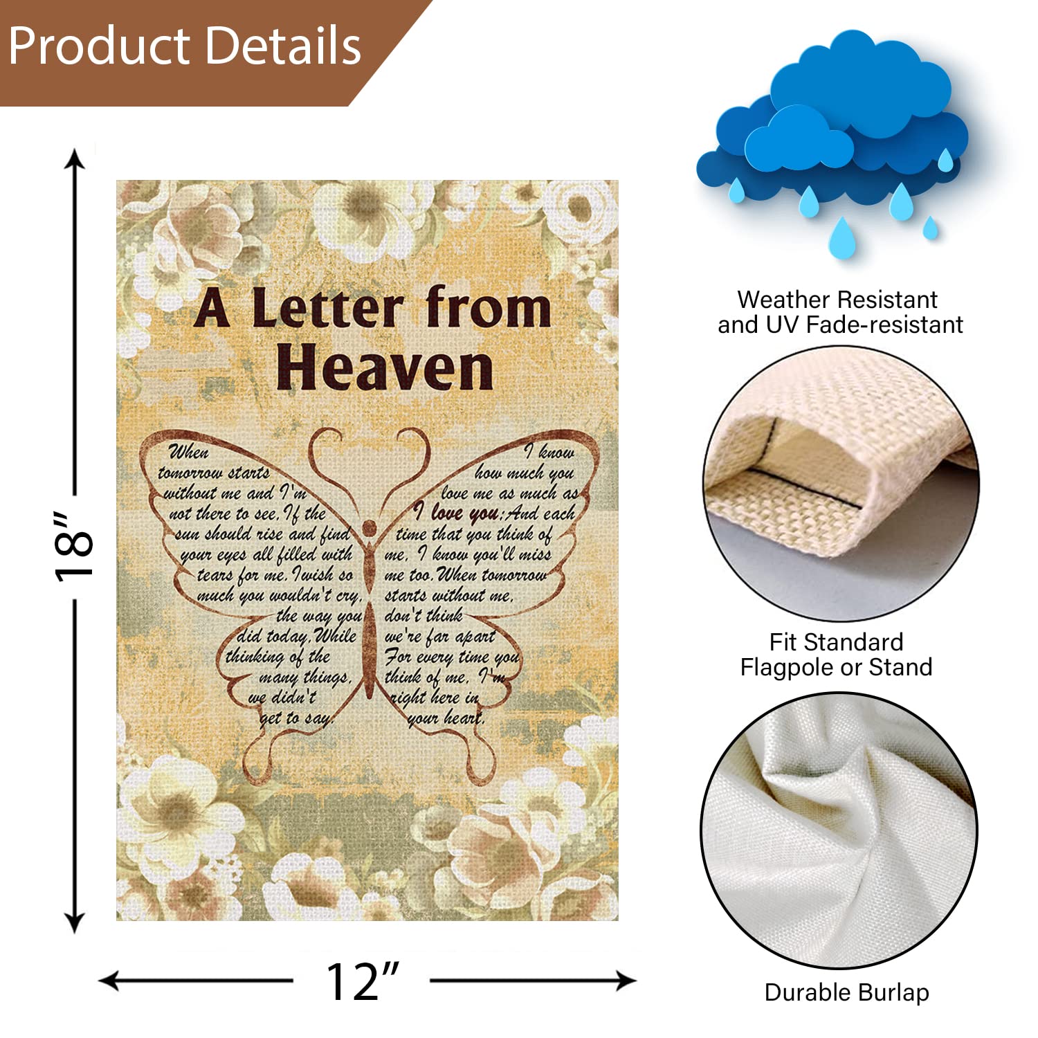 Gestecke Für Den Friedhof Moosherz-Grabgesteck Mit Engel & Rosen – 30cm, Handgefertigt Grabgesteck In Herzform 【Breite Anwendung】 Perfekt für jede Terrasse, Veranda oder Veranda und setzen Sie charmante dekorative Statements für jeden Hinterhof, Rasen oder Garten. Die Gartenflagge ist leicht, aber stark genug, um die ganze Weihnachtszeit zu halten. Halten Sie Erinnerungen am Leben: Unsere Gartenflagge ist mit friedlichen Schriften und bedeutungsvollem Schmetterling-Design bedruckt, um sich an den geliebten Menschen zu erinnern, der im Himmel ist. Produktmerkmale: Produkt: Gartenflagge., Material: hochwertige Jute., Maße:30., 5 cm x 45., 7 cm Anmerkungen: 1., Flaggenständer oder Stange nicht im Lieferumfang enthalten., 4., Aufgrund unterschiedlicher Beleuchtungsverhältnisse und verschiedener Monitore kann die Farbe des tatsächlichen Produkts leicht von der Abbildung abweichen. Langlebiges Material: Unsere Gartenflaggen sind aus maschinenwaschbarem Sackleinen und doppelt genäht, um die Haltbarkeit zu verbessern. Größe der Gartenflagge: Diese Gedenkflagge ist 30,5 x 45,7 cm groß. Grabschmuck für Friedhof. Produktgröße] Mit einer Größe von 31,8 x 45,7 cm passt diese lebendige Gartenflagge auf die meisten Standard-Flaggenständer (separat erhältlich... Gartenflagge "A Letter From Heaven", Beerdigung, Gedenkflaggen Für Doppelseitiger Druck: Beide Seiten der Gartenflagge enthalten den gleichen Druck, so dass sie aus beiden Richtungen gelesen werden kann.