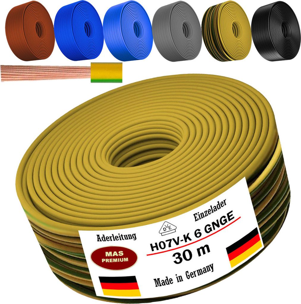 2,75 mm = 5,9366 mm² = 6 mm² (siehe auch Umrechnungstabelle von Durchmesser in Querschnitt bei den Produktbildern) Aluminium: Geringere Leistung, günstiger Feindrähtig und flexibel für schwierige Installationen. Aderleitung flexibel H07V-K 10 mm² grün-gelb Meterware Vollkupfer 99,9 % OFC, nach VDE 0281 - Brandverhaltensklasse nach EN 13501-6: Eca - Flammwidrig nach nach VDE 0482-332-1-2/IEC 60332-1-2 - CE 1 VERTEILERBAU 2 ZUHAUSE 3 INDUSTRIE 4 BÜRO 5 ELEKTRONIKSYSTEME Kupfer: Langlebiger, weniger Brüche H07V-K 1x6 RG100m braun PVC-Aderleitung - 6151 DIN46235: Rohrkabelschuh - Präzise für Feindrähte, Lockere Verbindungen vermeiden Tv Kabel 10m Aderleitung Kaufen Bei HORNBACH H07V-K 6mm2 Grün-gelb 10 Meter - Farbe: grün/gelb H07V-U starr Feste Verlegung in Rohren, Putz oder Schaltanlagen, 1 H07V-K 2 H07V-U Zur inneren Verdrahtung von Schaltanlagen, Geräten, Verteileranlagen • Große Farbauswahl für einfache Zuordnung., • U., a. Unser Service: Verlässlich, lokal Wärmemanagement: Kupfer effizienter H07V-K flexibel Feindrähtig und flexibel für schwierige Installationen. Elektromaterial günstig kaufen - Online Shop - H07V-K 1x10mm²... Kostenlose Lieferung für viele Artikel! Häufig gestellte Fragen Durchmesser vs. Querschnitt Unterschied: Durchmesser (mm) vs., Querschnitt (mm²) Kabelschuhe: DIN-Vergleich DIN46234: Quetschkabelschuh - Allgemein, lockere Passform Sicherheit durch richtige Auswahl