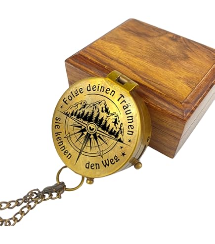 Diese Box bietet nicht nur eine sichere Aufbewahrungslösung, sondern dient auch als atemberaubendes Ausstellungsstück. Egal, ob Sie ein erfahrener Reisender, ein Antiquitätensammler oder jemand mit einer Wertschätzung für Handwerkskunst sind, dieser Kompass wird Ihre Fantasie begeistern. Vielseitig einsetzbar: Während er der Geschichte eine Hommage ist, ist dieser Kompass immer noch ein wertvolles Werkzeug für moderne Abenteuer. Handgefertigt und robust ist jedes Stück ein Unikat. ANTIKER MESSING BRUNTON Kompass (2,5) mit Holzkiste Maritim Sammlerstück & G... EUR 41,55 Dieser Kompass ist nicht nur ein Instrument, sondern ein Beweis für die dauerhafte menschliche Suche nach Entdeckung und Abenteuer. 【Qualitätsmaterialien】Der Kompass selbst besteht aus guten Materialien, um Langlebigkeit und Genauigkeit zu gewährleisten. Zeitloses Abenteuer: Erleben Sie den Geist des Abenteuers und der großen Erkundungen der Geschichte mit diesem Vintage-Kartenkompass in Holzbox. Entdecken Sie die Romantik der Erkundung und die Zuverlässigkeit traditioneller Handwerkskunst mit unserem Vintage-Kartenkompass in Holzbox. Größe und Tragbarkeit: Mit seiner kompakten Größe ist dieser Kompass leicht zu tragen, wohin Ihre Abenteuer Sie führen. Kompass Vintage Lasernauten Kompass Optik Mit Gravur Auf Dem Deckel Verschiedene Motive, Kompass Aus Messing In Kompass Seefahrt Die Holzkiste ist handgefertigt aus hochwertigem Holz, was eine zusätzliche Schicht von Eleganz und Schutz verleiht. Entdecken Sie die Romantik der Erkundung mit SIFAAT WORLD Vintage Kompass in einer eleganten Holzbox. Nehmen Sie es zum Wandern, Camping oder verwenden Sie es für Orientierungslauf und Geocaching. Edler und maritimer Tischkompass im nostalgischen Design. In der schönen Holzkiste kardangelagerter Messingkompass mit 360°-Teilung. Handgefertigt und robust ist jedes Stück ein Unikat Praktisches und durchdachtes Geschenk: Ob für einen Outdoor-Enthusiasten, einen Geschichtsfan oder jemanden mit einer tiefen Wertschätzung für Handwerkskunst, dieser Vintage-Kartenkompass ist ein durchdachtes und unvergessliches Geschenk.