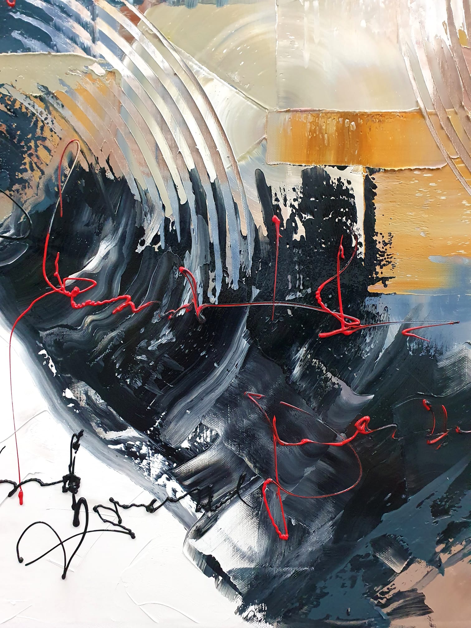 Blaues Ölgemälde Auf Leinwand Original Abstrakte Acryl Orange Farbe Gold Dicke Paste Stock