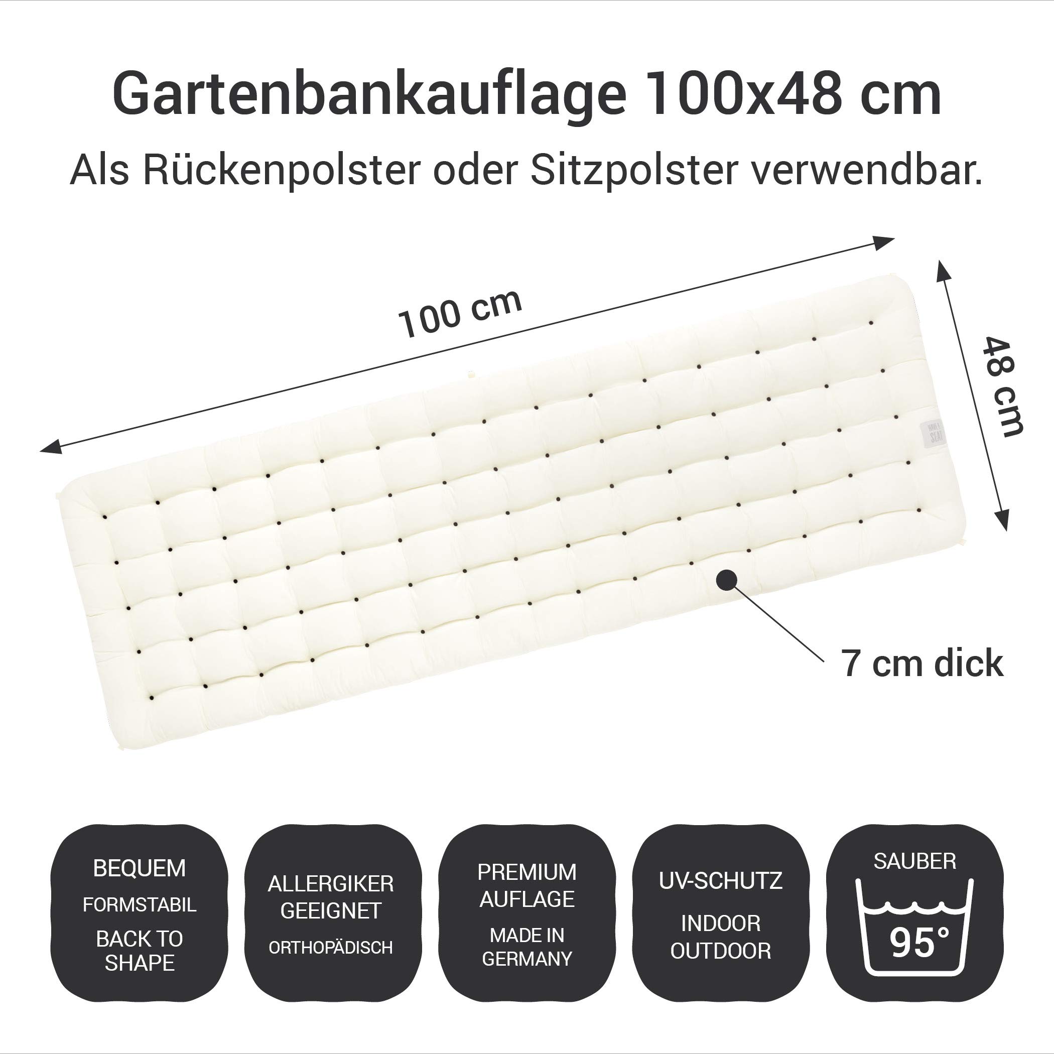 Durch die komfortable Riegel-Polsterung der Sitzauflagen aus hautfreundlichem Baumwollstoff entsteht ein einzigartiges und angenehmes Sitzgefühl (empfohlen für Gartenmöbel aus Holz, Stahl, Alu., ., ., ) Geeignet als Sitzbankkissen für: - Sitzbank - Holzbank - Gartenbank - Eckbank Eigenschaften: - bis 95° im Ganzen waschbar - Allergiker geeignet - Öko-Tex Standard 100 - robust & langlebig - Orthopädisch - Farbecht / UV-Schutz (8/10) - Indoor / Outdoor geeignet Produktdetails: - 1x Bankpolster mit Bänder (5 St. Selbst starke Verschmutzungen der Bankauflage sind nach einer Wäsche mit 95°C wieder sauber - das perfekte Bankkissen für einen sauberen Sitzplatz zum Wohlfühlen 70 cm) passend für Gartenbänke (180x50) - verwendbar als Sitzkissen oder Kissen für die Rückenlehne (ohne Möbel) Lieferumfang: 2x Sitzbankauflage 180x48 cm, 7 cm dick + 10x Befestigungsband (Länge ca. Bequem, Orthopädisch, Formstabil: Ein besonderes Merkmal jeder HAVE A SEAT Gartenbankauflage ist, dass es sich optimal Deinem Körper anpasst und Du dadurch wirklich entspannen und relaxen kannst., ., Durch unsere Back-to-Shape Technologie kehrt das Sitzbankpolster wie eine Matratze zudem immer wieder zu seiner Ursprungsform zurück . Hochwertiges und bequemes Auflagen Set bestehend aus Sitzpolster und Rückenpolster für Gartenbänke / Sitzbänke - Abmessungen je Gartenpolster 180 x 48 cm, Dicke 7 cm - (Indoor / Outdoor) Premium-Qualität: Premium heißt für uns, dass Du garantiert lange mit Deiner Sitzbank-Auflage Freude haben wirst. Komplett waschbar bis 95°C - die Gartenauflagen haben keinen abnehmbaren Bezug, dadurch wird auch die Füllung hygienisch sauber und rein - Trockner geeignet, Allergiker geeignet - Made in Germany Die von uns verwendeten Materialien sind von hoher Qualität und durch unsere zertifizierte Produktion kannst Du sicher sein, dass auch Dein über Jahre robust ihren Dienst erfüllen werden. Diese Sitzbankauflagen mit Wohlfühlfaktor sind sehr bequem - die Kissenauflagen können sowohl als Aussenpolster als auch im Innenbereich verwendet werden und sorgen für ein komfortables Sitzerlebnis Gartenbank Polster HAVE A SEAT Luxury - Deckchair Auflage 180x50 Cm, 8 Cm Dick, Bequeme Gartenbank Weiß