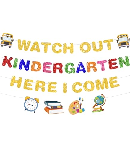 Material: Dieses Banner Watch Out Kindergarten Here I Come ist aus hochwertigem Karton gefertigt., Merkmale: 1., Umweltfreundlich., 2., Wiederverwendbar., 3., Oberflächenblitz., Einfach aufzuhängen., 5., Geeignet für eine Vielzahl von Anlässen. ★ Sie erhalten Watch Out Kindergarten Here I Come Banner mit Band und Kunststoffnadel. 1 x 2,4 m langes weißes Umhängeband. ★ Alle Banner sind aus hochwertigem Karton hergestellt, haben eine fusselfreie Glitzeroberfläche und sind glatt weiß auf der Rückseite Buchstabengröße: 15 cm hoch. Verschönern Sie Ihr Schulklassenzimmer und Ihre Party jederzeit und überall. Banner Mit Aufschrift "Watch Out Kindergarten Here I Come Für alle Anlässe geeignet: Dieses Banner kann Ihrer Party eine starke Atmosphäre verleihen. Begrüßen Sie Ihre kleinen Lernenden in der Welt der Bildung mit diesem lebendigen Banner "Welcome to Kindergarten". Hergestellt aus hochwertigen Materialien, ist dieses auffällige Banner die perfekte Ergänzung für jedes Klassenzimmer oder Schuleingang