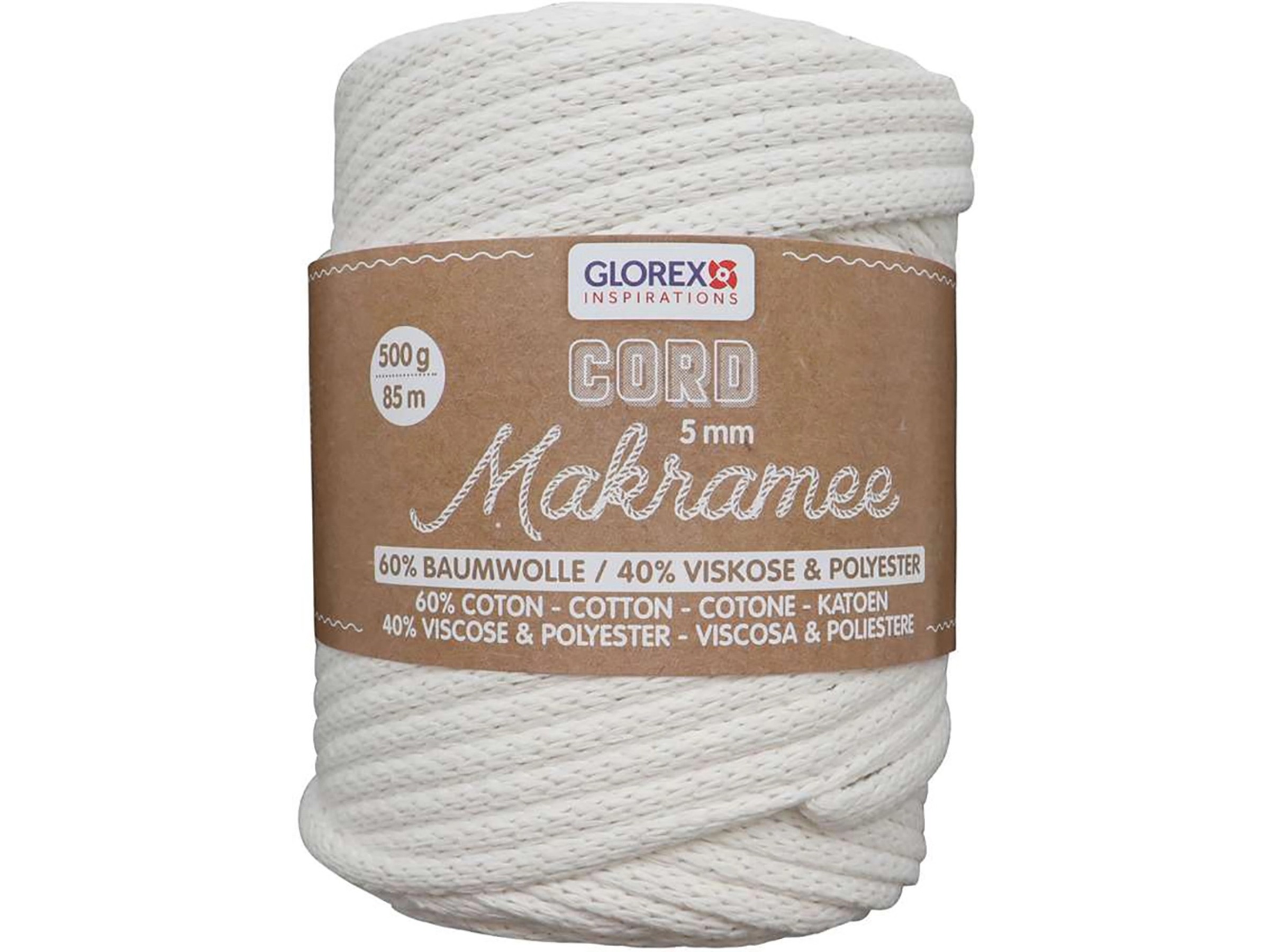 GLOREX 5 1006 12 - Makramee Cord 5 Mm, Superweiches Textilgarn Aus 60 % Baumwolle / 40 % Viskose, Zum Häkeln, Stricken, Knüpfen Und Textilen Gestalten, 500 G, Ca. 85 M, Gewebt Taupe