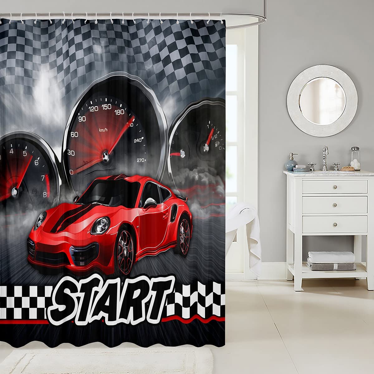 Rennen Auto Duschvorhang Für Jungen Kinder Cool Sport Auto Wasserdicht Badvorhang Mädchen Mann Extreme Sport Vorhänge Silber Rennauto Druck Badezimmer Dekor Schwarz Weiß Gitter Vorhang, 180Bx200L