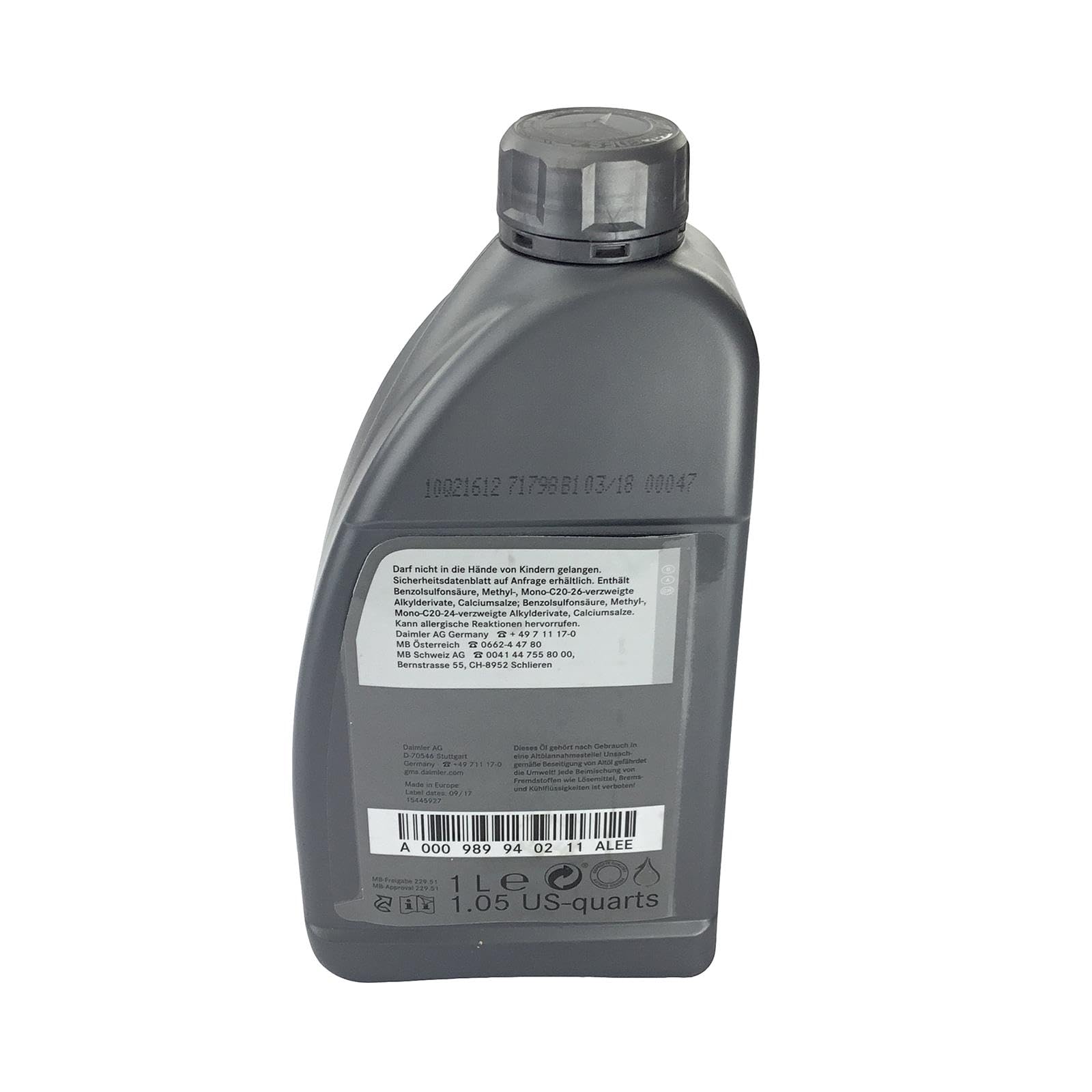 Selbst bei großer Kälte und Hitze sowie in extremen Fahrsituationen hält der Schmierfilm zuverlässig. Sicher in jeder Situation.Bei jeder Temperatur. einem Paar roten NB PARTS GERMANY Montage Handschuhen und einem Servicepaket (Einweghandschuh, Trichter und einem Ölwechselzettel) | OE Mercedes Benz Motorenöl MB229., 51| ) Motoröl, Freigaben: MB-Freigabe 229., 51 bei NB PARTS erhalten Sie das originale MB ÖL Die spezielle Formulierung gewährleistet eine Reduzierung der Emissionswerte über die gesamte Laufleistung und unterstützt so die Umweltanforderungen MERCEDES-BENZ MOTORENÖL 0W-20 MB 229.71 - 1 Lt - Tridontech Verlassen Sie sich auf einen minimalen Verschleiß und eine maximale Lebensdauer Ihres Motors: Mercedes-Benz Original-Motorenöl bewahrt Ihren Motor vor Korrosion – und das mit besonderer Ausdauer. Original Ölwechsel-Sets - 000 989 69 06 13, 000 989 94 02 11, 611 180 Enthalten in diesem Paket sind Einweghandschuhe, Einwegtrichter und Öl Karten. Im Zusammenspiel mit den Abgasnachbehandlungs-Systemen Ihres Motors vermindert Mercedes-Benz Original-Motorenöl zudem die Schadstoff-Emissionen.Video zum Produkt Bitte sorgen Sie in diesem Fall für eine geeignete Transportverpackung und eine ausreichende Frankierung. Original Equipment Manufacturer (O., E., M. Außerdem erhalten Sie ein Zubehörpaket dazu. Alternativ können Sie das gebrauchte Öl auch an unsere Annahmestelle senden. Wenn es um die Pflege deines Mercedes geht, ist das Mercedes-Benz 5W-30 MB 229.51 genau das Richtige. Dieses Motoröl sorgt für einen optimalen Schutz deines Motors, egal ob du ein Original Mercedes Motoröl 5W30 in 1 Liter oder in einer praktischen 20-Liter-Verpackung brauchst Motoröl 5w30 Mercedes 229.52 Original MERCEDES-BENZ Motoröle - 000 989 87 06 11 Liqui Moly Bei der Lieferung inkl. Falls Sie ein gewerblicher Endverbraucher sind, weisen wir darauf hin, dass wir uns Ihnen gegenüber zur Erfüllung unserer Annahmepflichten Dritter bedienen können. Sie reduzieren mit Mercedes-Benz Original-Motorenöl den Kraftstoffverbrauch Ihres Motors – und schonen gleichzeitig die Umwelt. Günstigere Verbrauchswerte sind das Ergebnis. Wir weisen außerdem darauf hin, dass unsere Annahmestelle über eine Einrichtung verfügt, die es ermöglicht, den Ölwechsel fachgerecht durchzuführen. Seine Komponenten und Additive entsprechen genau den besonderen Qualitätsanforderungen Ihres Motors.