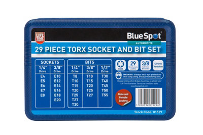 Die Bits sind aus widerstandsfähigem S2-Stahl gefertigt, was die Haltbarkeit und Festigkeit erheblich verbessert, was sie zu einem zuverlässigen Werkzeug macht, das harten und harten Anwendungen standhält. Die Stecknüsse sind aus wärmebehandeltem Chrom-Vanadium für erhöhte Haltbarkeit. Das Blue Spot Tools 10-teilige 1/2-Zoll-Schlag-Torx-Bit-Set ist ideal für die Verwendung mit 1,27 cm Werkzeugen. Lieferung in Kunststoffschale für bequeme Aufbewahrung. Die 15-teiligen Stecknüsse enthalten einen stabilen Kunststoffkoffer für eine schnelle und bequeme Aufbewahrung BRILLIANT TOOLS 3/8 Torx-Bit-Stecknuss T45 - BT021946