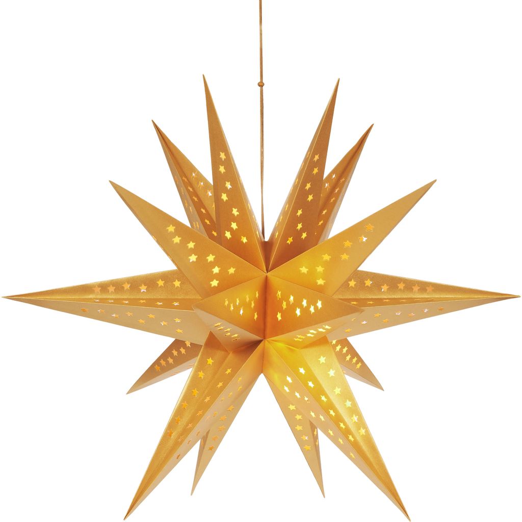 Papierstern Gold BRUBAKER Weihnachtsstern Zum Aufhängen Mit E14 Fassung - 60 Cm Papiersterne Mit Beleuchtung Zahnstocher Stern - Sonstige Sterne basteln Die Sterne sind nicht für den Außenbereich geeignet., Stimmungsvolle Beleuchtungseffekte , 62 cm x 60 cm BRUBAKER Weihnachtsstern zum Aufhängen mit E14 Fassung - 60 cm Papierstern Set mit 3,5 m 🌟 Festlicher Glanz für die Feiertage: Unsere 60 cm großen Adventssterne tauchen dein Zuhause in festliches Licht und schaffen eine warme... Sie lassen sich mit wenigen Handgriffen einfach auf ihre Lampenfassung mit Glühlampen bis zu 40 Watt montieren oder erwerben eine Lampenfassung aus unserem Händlershop. Vielseitige Farboptionen: Unser Weihnachtsstern-Set bietet verschiedene Farbkombinationen, darunter Rot und Weiß mit goldenen und silbernen Glitzer-Mustern, Weiß und Silber mit einem eleganten Silbermuster sowie Weiß und Gold mit funkelndem goldenem Glitzer Ob als Dekoration für ihr Fenster oder als ein stimmungsvoller Blickfang im Wohnbereich; die Sterne sind schon in unbeleuchtetem Zustand ein Juwel, das Sie in die richtige Stimmung für die Advents- und Weihnachtszeit bringt. Hinweis: Auf Produktbildern gezeigtes Zubehör sowie Deko-Artikel sind nicht in der Lieferung inbegriffen. Tipp: Bei uns können Sie auch noch eine andere Ausführung der Papiersterne kaufen, die sich ganz wunderbar mit dieser Variante der Papier-Weihnachtssterne kombinieren lassen. Abstandshalter für die Lampenfassung liegt bei 25cm Größe Stern (Ø×D): ca. Jeder Papierstern hat 7 Zacken und kann sowohl am Fenster, der Wand oder auch innerhalb eines Dekoloops oder Kranz befestigt werden. Die Weihnachtsdeko-Sterne besitzen aufgeklappt einen Durchmesser von etwa 20 Zentimetern und eine Dicke von etwa 6 Zentimetern.