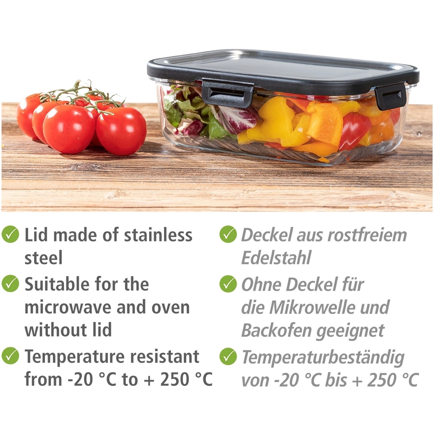 Dazu wurden robuste und witterungsbeständige Materialien verwendet. Ein hohes Maß an Kundenzufriedenheit und ein faires Preis-Leistungs-Verhältnis spielen dabei eine zentrale Rolle. Über uns Mit WENKO wird das Leben jeden Tag ein wenig angenehmer und komfortabler. 3Pcs Glas Gläser mit Luftdichten Dichtung Ball Kor... – Vicedeal Langlebige Produkte, die aus verantwortungsvollen Quellen stammen und unter fairen Arbeitsbedingungen produziert werden sind unser Bestreben. WENKO bietet mit seinem BLACK OUTDOOR KITCHEN Sortiment eine große Vielfalt an nützlichen und gleichzeitig stylishen Produkten - Lassen Sie sich von diesen ausgewählten Beispielen inspirieren! Platzsparend stapelbar, vielseitig einsetzbar ✓ Wenko Glas Frischhaltedose Steel Black Outdoor Kitchen 1 l ➜ Grillutensilien im Online-Shop kaufen Der eigene Garten oder die Terrasse werden zum Treffpunkt des gemütlichen Beisammenseins mit Familien und Freunden. WENKO Utensilienkorb Baco Sein Gegrilltes mag jeder anders gewürzt. Um Verschmutzungen muss sich hier niemand sorgen: Die Silikonmatte kann in der Spülmaschine gereinigt werden. Aufräumen leicht gemacht: Nach der Grillparty bietet die Serie clevere Reinigungshelfer, mit denen das Aufräumen leicht von der Hand geht. Glas Frischhalte Dose Lunch Box Behälter Deckel Blau WENKO, das sind Produkte rund um Bad, Küche, Wäsche und Wohnen. Praktische Größe: Mit 1 Liter Fassungsvermögen bietet die Aufbewahrungsbox mit Deckel genügend Platz für Vorräte - passt geeignet in Küche, Kühlschrank und Gefrierschrank Der Metallkorb mit flexiblem Holzgriff ist nicht nur besonders praktisch, sondern macht auch als dekoratives Accessoire auf dem Esstisch Eindruck. WENKO Silikonablage Minu Grillen und Kochen im Freien macht extrem viel Freude – ganz im Gegenteil zu den Flecken, die hin und wieder beim Ablegen von Grillzange, Pfannenwender und Co., entstehen. Immer innovativ Bei WENKO finden Sie nicht nur gute, sondern bessere Ideen! Vielseitige Nutzung: Frischhaltedosen mit Deckel eignen sich zum Einfrieren, Zubereiten und Aufbewahren von Speisen - stapelbar, um Platz in Küche und Kühlschrank zu sparen Die innovativen Produkte verfolgen stets Die bessere Idee und zeugen von Erfindergeist und eindrucksvollem Design. Mit Accessoires der BLACK OUTDOOR KITCHEN ist der Gartentisch stilvoll eingedeckt. Lassen auch Sie sich von den wunderschönen und innovativen Accessoires und Ideen für Ihren Haushalt inspirieren. Entdecken Sie die Welt von WENKO! Im Sommer verlagert sich das Leben nach draußen: Die durchdachten Küchen-Accessoires erleichtern viele Handgriffe auf stilvolle Weise In der warmen Jahreszeit rücken kulinarische Genüsse vom Grill oder aus der Outdoor-Küche in den Vordergrund. WENKO Küchenhaken Push Alle Hände voll zu tun? Damit Küchenhandtücher und Lappen nicht unschön auf der Arbeitsfläche herumliegen, bietet der Haken Push eine bequeme Möglichkeit zum Aufhängen. Dazu muss nicht einmal die kleine Stofflasche des Tuchs umständlich gesucht werden. Am Tisch: Ansprechend gestaltet wird der gedeckte Tisch mit den passenden Accessoires – vom Serviettenhalter bis zu praktischen Öl- und Essig-Spendern. WENKO Glas Frischhaltedose Pacu 1 L, auslaufsichere Aufbewahrungsdose aus Glas mit Deckel und Silikon-Dichtung zur luftdichten Aufbewahrung im Kühlschrank, platzsparend stapelbar, 21 x 7,5 x 15 cm - Preisvergleich: Tests, Infos & Preisvergleich Doch irgendwann ist auch der größte Grill-Fan satt. Der Name WENKO steht bereits seit Ende der 1950er Jahre für Erfolg. Luftdicht und Auslaufsicher: Silikondichtung und Clipsystem halten Speisen frisch und sicher - geeignet für die Aufbewahrung von Lebensmitteln in der Küche oder unterwegs WENKO übernimmt Verantwortung In der heutigen Zeit sind Nachhaltigkeit und das entsprechende Bewusstsein ein zentrales Thema. Frischhaltedose: WENKO Glas Frischhaltedose Pacu - robuste 21 x 7,5 x 15,5 cm aus Glas mit luftdichtem Silikonverschluss - geeignet für Küche, Aufbewahrung und Mikrowelle Das unverzichtbare Geschirrhandtuch wird einfach in den mattierten Haken aus Edelstahl und Kunststoff gedrückt und bei Bedarf wieder herausgezogen. Vom klassischen Wandhaken bis hin zum mobilen Kleiderschrank finden Sie bei WENKO nicht nur gute, sondern bessere Ideen - unser stetiger Anspruch und gelebtes Motto. WENKO Frischhaltedose »Black Outdoor Kitchen«, transparent/silberfarben, geeignet für: Küche, Universelle Glas-Frischhaltedose mit Deckel aus Edelstahl, Dank Clipsystem auslaufsicher und luftdicht verschließbar, Ohne Deckel: mikrowellen-, backofen- und spülmaschinengeeignet, Temperaturbeständig von -20 °C bis + 250 °C, (B x H x T): 23 x 7,5 x 17 cm, Glas/Edelstahl/Silikon, 1500 ML Genießen Sie die schmackhaften Überbleibsel einfach zu einem späteren Zeitpunkt. Da viele Speisereste auch am nächsten Tag noch gut schmecken, bietet die Serie die Frischhaltedosen Steel aus Glas, die ohne Deckel für Backofen oder Mikrowelle geeignet sind. Da die Dosen aus Glas nicht verfärben, kann im Vorfeld der Grillparty auch perfekt Fleisch darin mariniert werden und in Ruhe einziehen.