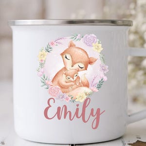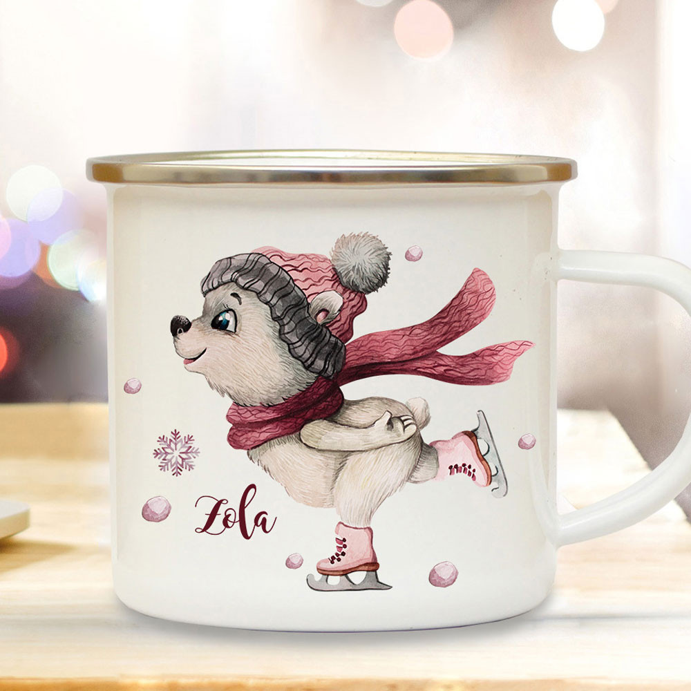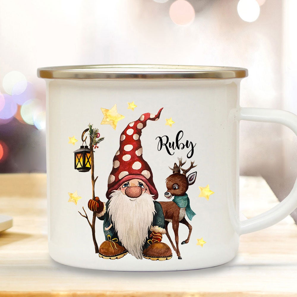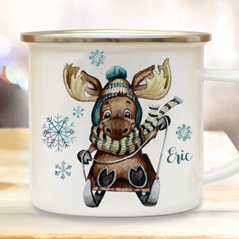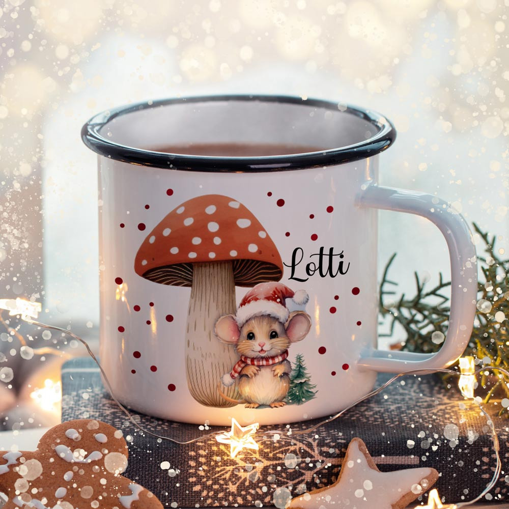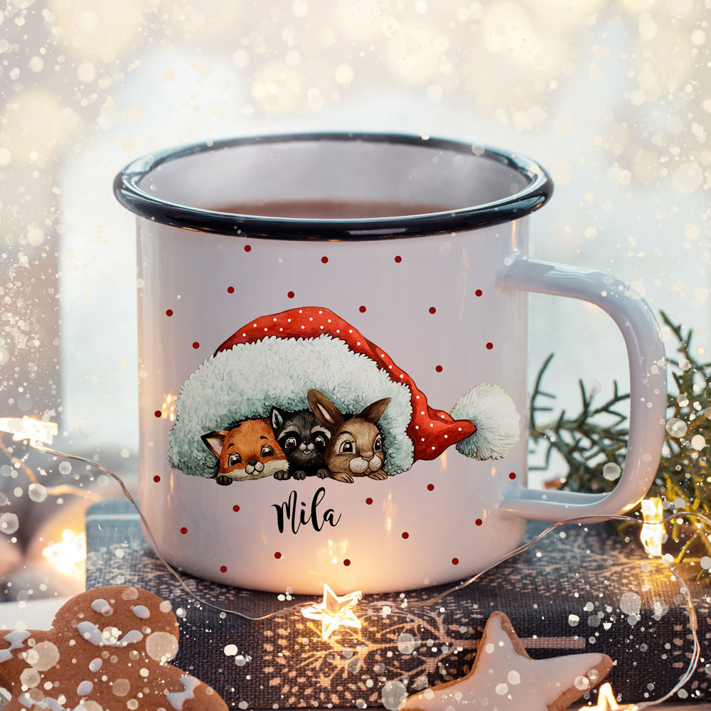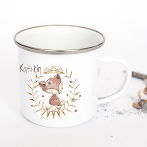 Emaille Becher Camping Tasse Winter Fuchs Weihnachtsbaum & Name