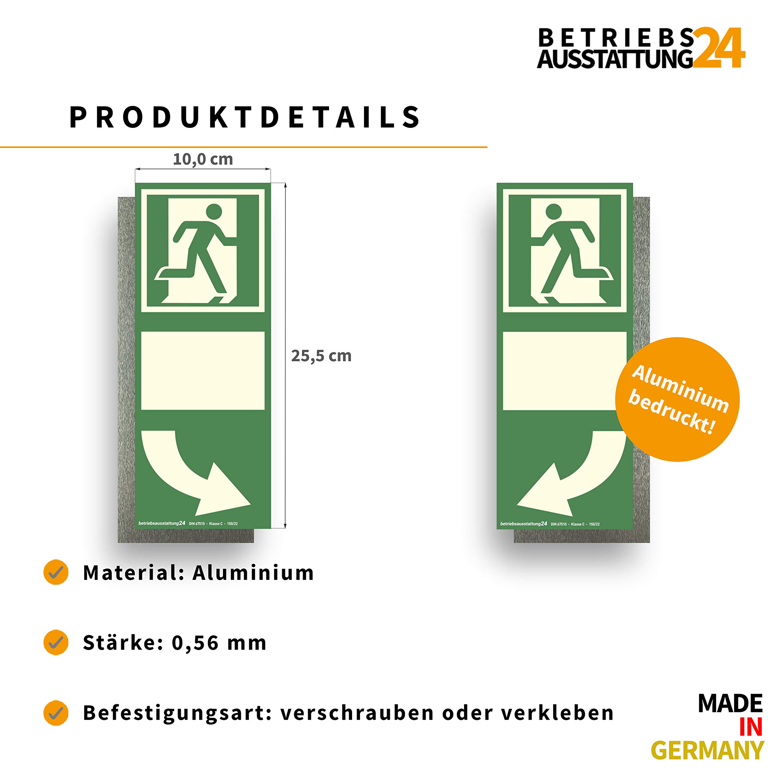 Notausgangsschild Nachleuchtend Betriebsausstattung24 Bodenmarkierung Für Türbereiche "Fluchtweg Muss Freigehalten Werden" - Symbol Fluchtweg - BxL: 98,5 X 49,25 Cm - Rutschhemmung R 10 - Grün - Selbstklebend Erste Hilfe Aufkleber Für den Einsatz in Betrieben, Firmen, Fabriken, Schulen, Krankenhäusern, öffentlichen Einrichtungen, Supermärkten u., v., m. Maße: B x H 10,0 x 20,5 cm| Material: Aluminium, langnachleuchtend | Befestigungsart: Zum Verkleben | Gewicht: 23 g | Materialstärke: 0,56mm | Leuchtdichte (mcd): 300 Notausgang links (Kombischild), langnachleuchtend... Jetzt online kaufen: Notausgang links - Fluchtweg-Bodenmarkierung, rund, langnachleuchtend, DIN EN ISO 7010 - bei - Fluchtwegkennzeichnung in langnachleuchtender Ausführung König Werbeanlagen Hinweisschild Fluchtwegkennzeichnung Langnachleuchtend Rutschhemmende Oberflaeche S0v5d0ja voelkner _dort wo die SAFETYMARKING-Auswahl groß ist ✓ ► SafetyMarking Fluchtweg-Leitmarkierung Aluminium linker Fußabdruck 17.7655 (B x H) 205mm x 100mm 1St.