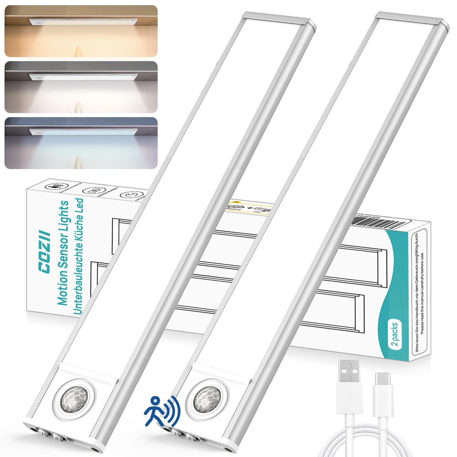 LED Schrankbeleuchtung Mit Bewegungsmelder, 2 Stück 30cm Unterbauleuchte Küche LED, Magnetische