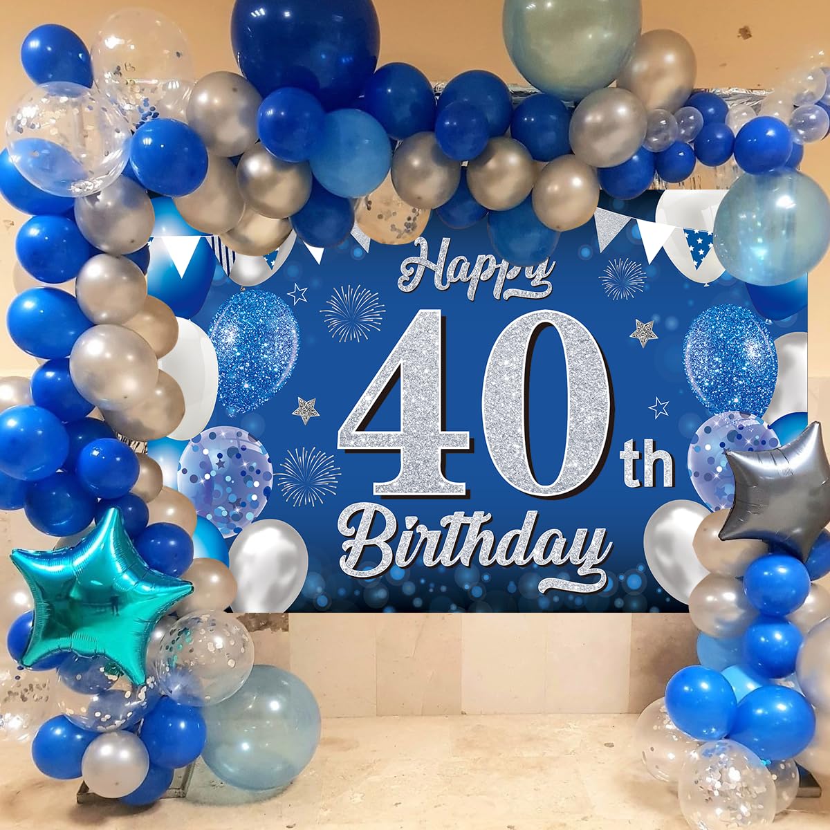 DPKOW Silberblau Happy Birthday 40 Jahre Dekoration Für Männer, Happy Birthday 40 Jahre Hintergrundtür Banner Dreieck Banderole Happy Birthday 40 Jahre Konfettiballons Jungen Silberblau