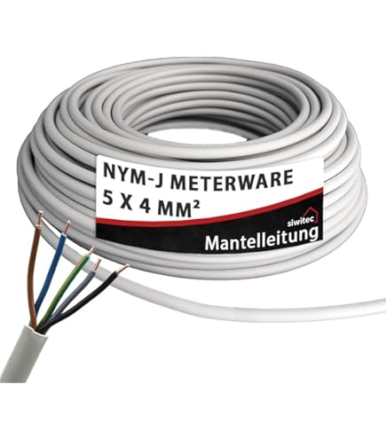✔️ ENTSPRICHT VDE-NORM: Unser Feuchtraumkabel wird nach den Richtlinien des Verband deutscher Elektrotechnik hergestellt und entspricht den sehr strengen Vorschriften der VDE-Norm. ✔️ STANDARD NYM-J Feuchtraumkabel Mantelleitung NYM-J Strom-kabel. MAS Premium Feuchtraumkabel Stromkabel von 5m bis 70m Mantelleitung NYM-J 5x4 mm² Elektrokabel Ring für feste Verlegung (25 m) von MAS-Premium. Feuchtraumleitungen günstig online kaufen bei Möbel & Garten ✔️ PERFEKT ZUR FESTEN VERLEGUNG: Verlegung über, auf, in und unter Putz, in trockenen, feuchten und nassen Räumen, im Mauerwerk oder in Beton (ausgenommen die direkte Einbettung in Rüttel- oder Stampfbeton). Nicht für Verlegung im Erdreich. Das Produkt ist konform zur 2006/95/EG-Richtlinie (Niederspannungsrichtlinie). 5, 10, 15, 20, 25, 30, 35, 40, 50, 60 oder 70m Feuchtraumkabel NYM-J 5x4 mm² Mantelleitung Elektro Strom Kabel OFC MADE IN GERMANY Als Installationsleitung, zur Verlegung auf, in und unter Putz, in trockenen, feuchten und nassen Räumen, sowie im Mauerwerk und im Beton. Nennspannung 300/500 Volt Prüfwechselspannung = 2000 Volt und entspricht dadurch den Standards in der Branche. EBROM NYM-J 5x4 mm² Mantelleitung -viele Längen- Installationsleitung ✔️ MAS Premium: Wir von MAS-Premium stehen für höchste Qualitätsstandards. blau, braun, schwarz, weiß, grüngelb. Du bist auf der Suche nach einem zuverlässigen Kabel für deine Elektroinstallationen? Das NYM-J 5x4 mm² Kabel bietet dir die perfekte Kombination aus Sicherheit und Flexibilität. Mit verschiedenen Längen zur Auswahl, deckt es die Bedürfnisse sowohl von Heimwerkern als auch von Profi-Elektrikern ab 420 kg/km Lieferumfang - Feuchtraumkabel Strom Kabel NYM-J 5 x 4 mm², 5, 10, 15, 20, 25, 30, 35, 40, 50, 60 oder 70m Länge, Aderfarben: blau, braun, schwarz, grau, grüngelb MAS Premium Feuchtraumkabel Stromkabel von 5m bis 70m Mantelleitung NYM-J 5x4 mm² Elektrokabel Ring für feste Verlegung (25m 14,20 +/- 0,5 mm- Außenmantel: Farbe grau RAL 7035- Arbeitstemperatur: -40°C bis 70°C, bei Verlegung 5°C bis 70°C- Verlegung auf, in, unter: Putz, trockenen, nassen Räumen, im Beton, Mauerwerk- Widerstand: Leiterwiderstand 4,61 Ohm/km- Innenleiter Querschnitt: 5 x 4 mm²- Aderfarben: blau, braun, schwarz, grau, grüngelb- Laufender Meter: 5, 10, 15, 20, 25, 30, 35, 40, 50, 60 oder 70m- Arbeitstemperatur: -40°C bis 70°C, bei Verlegung -5°C bis 70°C - Kleinster Biegeradius: 56,8 mm- Gewicht: ca.