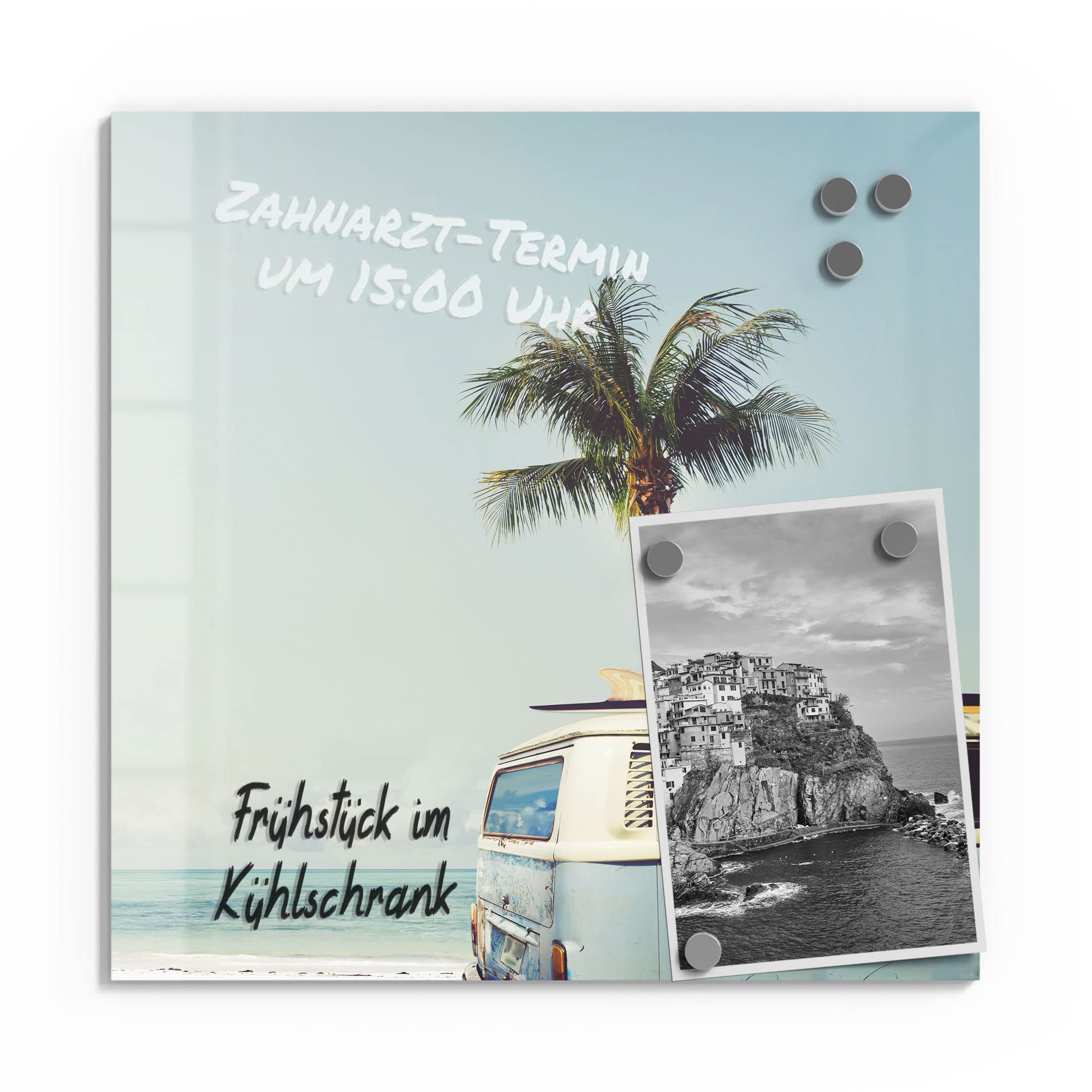 DEQORI Glas-Magnettafel | 30x30 Cm Groß | Motiv Surfer-Bus Am Strand | Memo-Board Aus Glas | Magnetboard Inkl. Magnete, Stift & Tuch Für Küche & Büro | Tafel Magnetisch & Beschreibbar