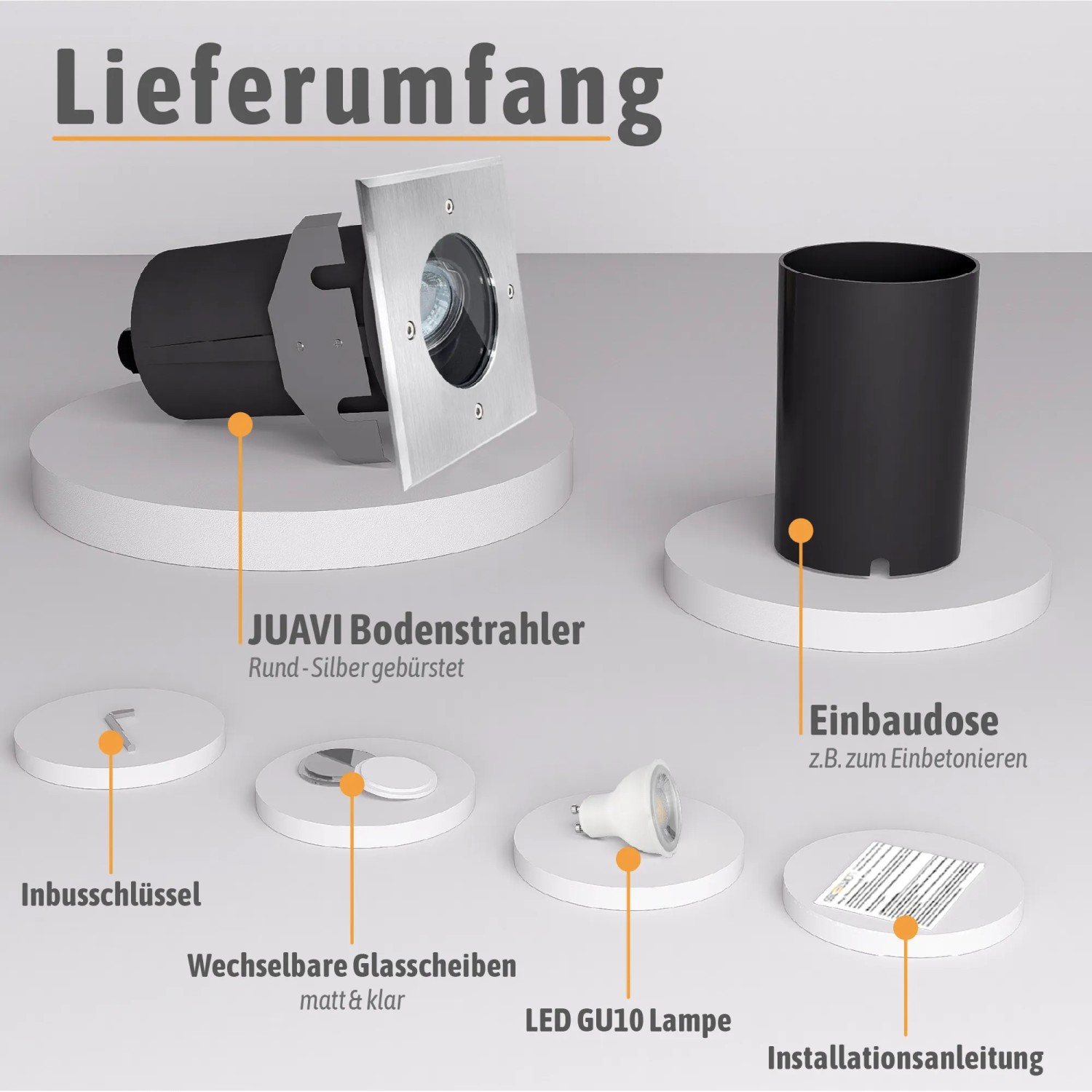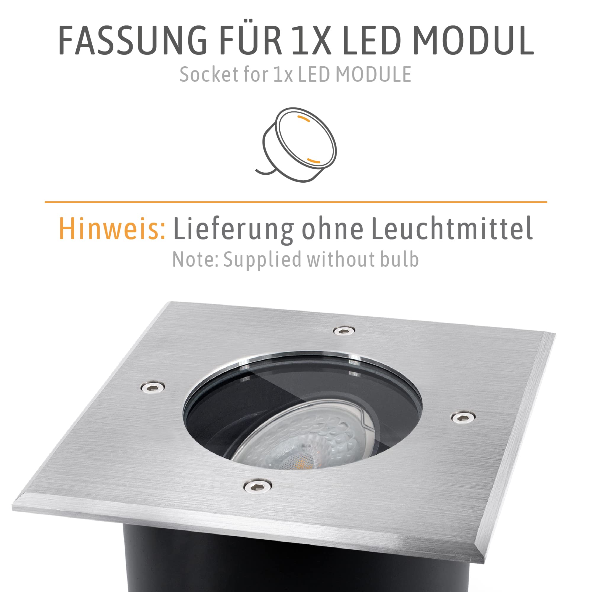 Mit flachen Einbaumaßen (120mm) und praktischer Durchgangsverdrahtung zum Anschluss / Durchschleifen von mehreren Außenleuchten Geringe Einbautiefe mit oder ohne Kunststoffdose: 120 mm Im Inneren der Einbau Bodenleuchte können Sie ein beliebiges GX53 Leuchtmittel (mit Standardmaßen) einsetzen. Anschluss: geeignet für 230 Volt SSC-LUXon Juavi Bodeneinbaustrahler Außen Schwenkbar Silber IP67 mit GU10 LED 3W Warmweiß Frontplatte (silber gebürstet) 103 x 103 x Stärke 3 mm - Lochmaß bei Montage Ø 95 ohne / Ø 98 mm mit Einbau Kunststoffdose Zusätzlicher Ein- und Ausgang an der Rückseite für Durchgangsverdrahtung / Durchschleifen Montage, Material & Maße Material: Alu-Druckguss, Kunststoff, Glas Leuchtmittel und Kunststoffdose für Boden- und Wandmontage 74 mm (ohne Dose 70 mm) belastbar bis max.2.000 kg - trittfest und befahrbar Kabelverschraubung PG M18x1,5, für Kabelaußenquerschnitte 8-11,5 mm Geeignet für Erdkabel / Starkstromkabel NYY-J 3x1,5 mm² Durchgangsverdrahtung - Die Leuchte verfügt an der Rückseite über Ein- und Ausgang (Anschluss in Reihe möglich) Zusätzliche Verteilerdosen werden nicht benötigt. EXTRA FLACH - mit einer sehr geringen Einbautiefe von 120 mm FÜR AUFFAHRT UND HOF - trittfest und befahrbar bis 2000 Kilogramm Kabelverschraubung PG M20x1,5, für Kabelaußenquerschnitte 7-13 mm Trittfest & befahrbar: Ja - bis max., 2000 kg Der schlichte und quadratische Bodenleuchte JADINA wird durch viele praktische Funktionen zur optimalen Beleuchtung auf Ihrer Terrasse, auf dem Balkon oder im Garten. Abmessung Frontplatte: 103 x 103 mm - Stärke 3 mm Maximale Maße des LED Modul: 50 mm x 30 mm Lieferumfang: 3x Bodenleuchte eckig, 3x wechselbares LED Leuchtmittel 4W neutralweißes Licht, 3x Einbaudose, 3x 2 Glasscheiben, 3x Anschlussklemme Artikeldetails und technische Daten Bodeneinbaustrahler Fassung: GX53 Echtglaseinlage matt satiniert zum Anschluß an 230 Volt - kein zusätzlicher Trafo erforderlich Schutzart IP67 - für Außenbereich & Garten Maximale Wattage des Leuchtmittels: 9 W Material: Aluminium, Glas, Kunststoff Optik: Edelstahl gebürstet Abmessung Edelstahlplatte Durchmesser/ Stärke = 119 mm/ 3,5 mm Lochmaß Durchmesser ca. 3er Set LED Einbau Bodenleuchte JADINA einladendes Licht für Haus & Garten Bei LED Bodeneinbauleuchten stehen Licht & Funktionen im Vordergrund. Led Spots 230v LED Bodenleuchte JADINA Schwenkbar, Flach & Eckig IP67 Mit FourSTEP LED Led Lampe Schaffen Sie mit dem 3er Pack Boden-Einbaustrahler JADINA eine einladende Atmosphäre in Ihrem Garten, auf der Veranda oder an Hauseingängen Optik: Edelstahl gebürstet, Farbe: Silber, Elektr., Schutzklasse: I, IP-Schutzart: IP67 QF-2 Alu LED-Einbauspot flach schwenkbar inkl. fourSTEP Dim LED Modul... SSC-LUXon 3 Stück JADINA Bodenstrahler Außen schwenkbar flach mit LED 5W 230V neutralweiß - 3x Bodenspots rund befahrbar IP67 Außenstrahler HIGH POWER - Konstsmide 7880-370 - KS Licht