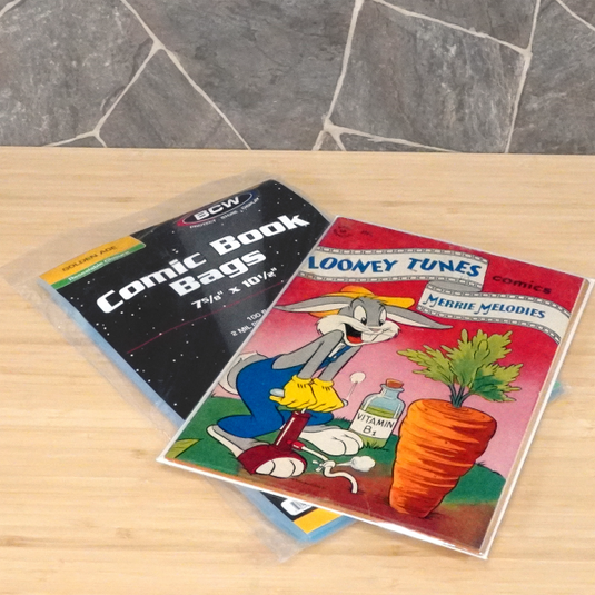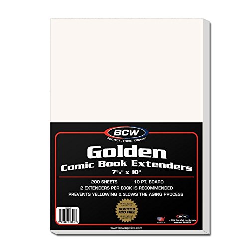 Comic Schutzhüllen UNBEKANNT BCW Golden Comic Book Bags (100 Ct.) Sammelkarten Hard Plastic 500) BCW Resealable Golden Age Comic Bags and BCW Golden Age Comic Book Boards. Use with BCW Golden Poly & Mylar Bags. Holds most golden comics Diese Taschen haben einen wiederverwendbaren Klebestreifen am Körper der Tasche, so dass der Sammler die obere Klappe umklappen und den Comic einschließen kann. Verwenden Sie diesen Artikel, um Ihre goldenen Comics zu schützen und aufzubewahren. BCW GOLDEN COMIC Book Bags (100) - EUR 7,90. ZU VERKAUFEN! Stärke: 2 Mil. Originalgrößenangabe: 7 5/8" x 10 1/2" + 1 1/2" 187318051513 Comic | Zubehör | OFCS - Ihr Fachgroßhändler für Spielwaren Säurefreie, sichere Aufbewahrung 3,8 cm (1 1/2 Zoll) wiederverschließbare Klappe