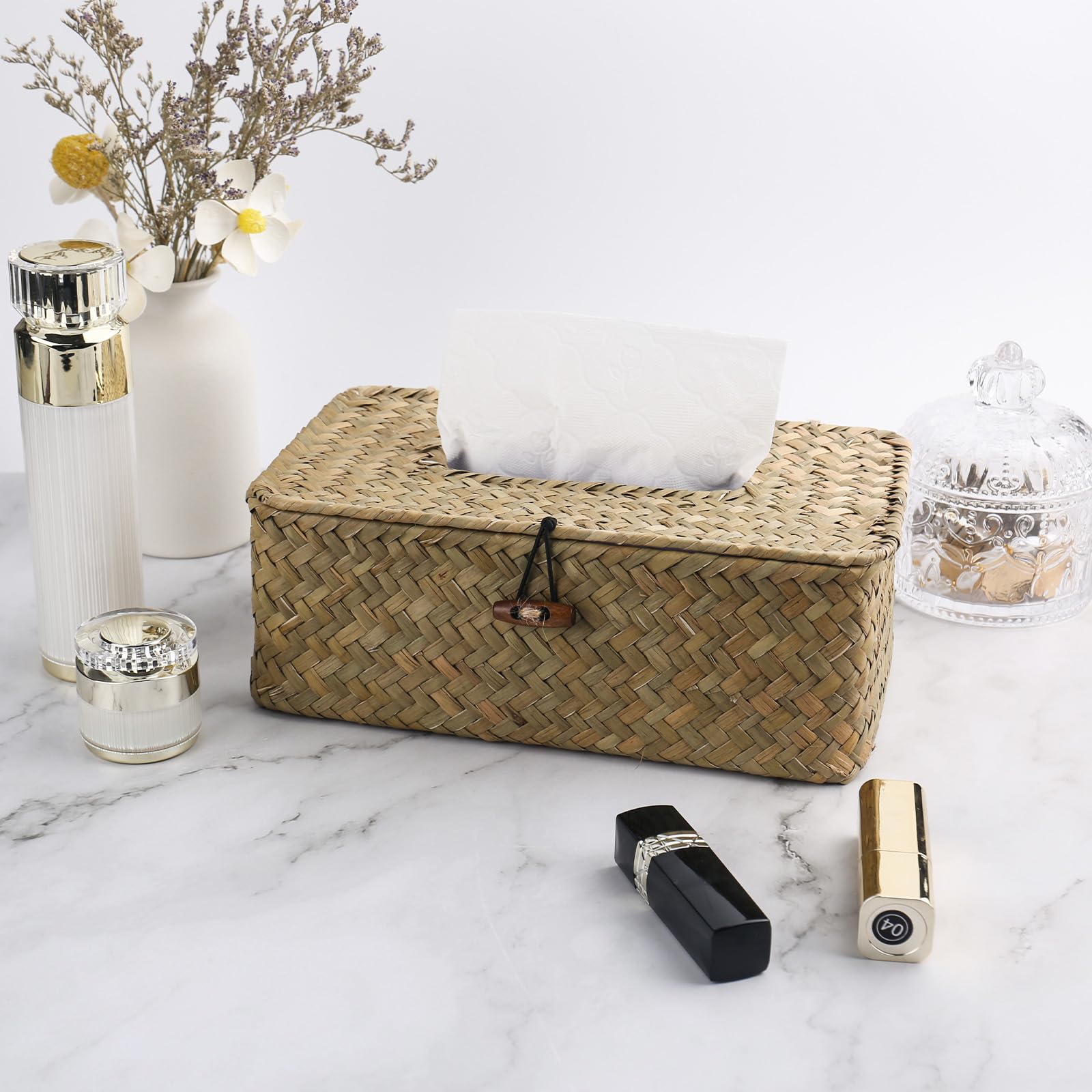 Es passt nicht nur in eine rechteckige Standard-Tücherbox und funktioniert perfekt, um den ursprünglichen Taschentuchkarton zu verstecken, sondern passt auch zu jedem Tisch- oder Arbeitsplattendekor und fügt Ihrem Zimmer natürliche Elemente hinzu. Natürliches Seegras ist umweltfreundlich und besonders für den Heimgebrauch geeignet. Taschentücher Box, SLHEQING Taschentuchbox Gold Kosmetiktücher Box Der elastische Schnallenverschluss dieser Taschentuchbox macht das Austauschen der leeren Box sehr einfach, und es ist stabil genug, dass Sie sich nicht mit der Box herumschlagen müssen, um ein Taschentuch herauszuziehen. Die Konstruktion ist robust und robust für eine lange Nutzungsdauer. Passt nicht nur in eine rechteckige Standard-Taschentuchbox und funktioniert perfekt, um den ursprünglichen Taschentuchkarton zu verstecken. Beschreibung: Wenn Sie es nicht mögen, dass die Klexxxx Taschentuchboxen unansehnlich und zu hell geworden sind, ist diese gewebte Taschentuchbox die perfekte Lösung. Lieferumfang: Rechteckige Taschentuchbox aus Seegras IGNPION 3 Fächer Seegras Aufbewahrungskorb mit Deckel Badezimmer Hinweis: Unsere rechteckige Taschentuchabdeckung ist so konzipiert, dass sie für rechteckige Klxxxxx-Tücherboxen passt. Knebelverschluss für einfachen Austausch, während die Taschentuchbox sicher im Inneren bleibt: Der elastische Schnallenverschluss dieser Taschentuchbox macht das Austauschen der leeren Box sehr einfach, und sie ist robust genug, dass Sie sich nicht mit der Box herumschlagen müssen, um ein Taschentuch herauszuziehen. Material]: Diese Taschentuchbox besteht aus Papierseil und ist robust für den Langzeitgebrauch. 1 x Taschentuchbox-Halter. [Weberei]: Gewebter Serviettenhalter im Boho-Stil mit aufwendiger Webung, robust und ästhetisch ansprechend zugleich Perfekt für Badezimmer, WC, Küche, Wohnzimmer, Schlafzimmer, Esszimmer, Tisch, Schreibtisch, Auto, Büro oder Hotel usw. Hohe Qualität – Die attraktive rechteckige Taschentuchbox ist aus Seegras gestrickt mit Metallrahmen; der Metallrahmen hält sie robust und langlebig für dauerhaften Gebrauch vor Durchhängen Vielseitige Taschentuchbox aus Seegras kann an den meisten Orten und Anlässen verwendet werden.