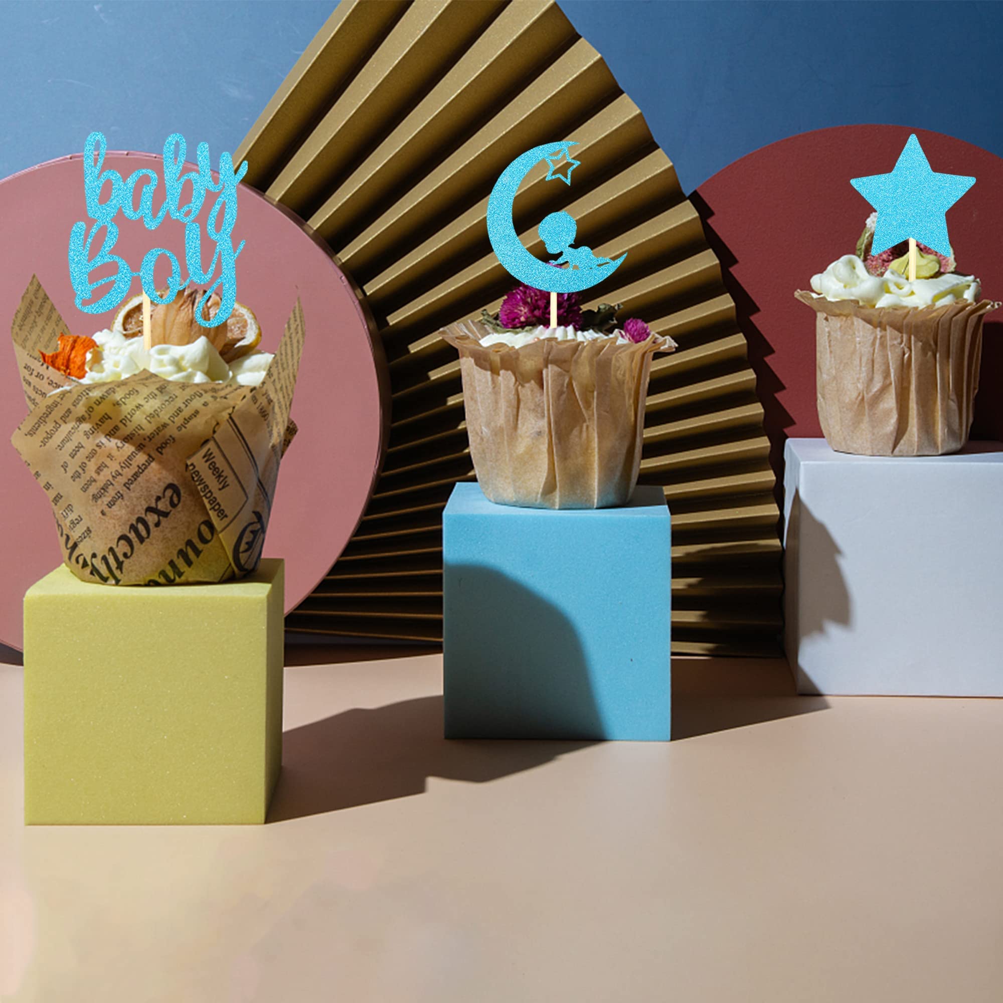 Blumomon 24 Pieces Deep Blue Baby Shower Boy Cupcake Toppers With Glitter Star Moon Cute Baby Boy Swan It's A Boy Cake Decorations Baby Shower Boys Birthday Party Cake Decorations Accessories
