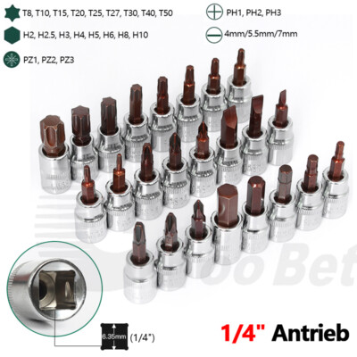 Geeignet für eine Vielzahl von Gelegenheiten, wie Automobil, Mechanik, Motorrad, auch für die Wartung im Haushalt. Satz 10 Bit VDE isolierter Schraubendreher Yato YT 28290 Merkmale: Vielseitig einsetzbar für extreme Zugänglichkeit. Vorwärts- und Rückwärts-Ratschenhebel. Verwendung mit Ratsche, um die Geschwindigkeit beim Anziehen von Torx-Antriebsverschlüssen zu verbessern. Spezifikation: 1/4 Zoll Ratsche Material: Chrom-Vanadium-Stahl., Lieferumfang: 1 x Ratschenstecknuss Insights - Innensechskant-Bit-Stecknuss, CR-V S2 Stahl Schraubendreher Bit Stecknuss 1/4 Zo Exklusiv Popularität - , 37 days for sale on eBay. 0 verkauft, 1 verfügbar Flach Bit Stecknuss, CR V S2 Stahl Schraubendreher Bit Stecknuss 1/4 Zoll Antriebswerkzeug Für Zuhause, Büro Und Werkstatt – FD4 Schlagfeste S2-Stahl-Schraubendreher-Bits für zusätzliche Haltbarkeit und Verwendung in Schlagschraubern. Der eingepresste phosphatierte Bit mit Kreuzschlitz-Profil hat die Größe PH2 (Phillips). Die Bit-Stecknuss hat eine Gesamtlänge von 38 mm, die Klingenlänge beträgt 17 mm. Die Oberfläche ist an der Antriebsseite und an der Bitseite matt verchromt, diese ist durch eine Längsrändelung getrennt