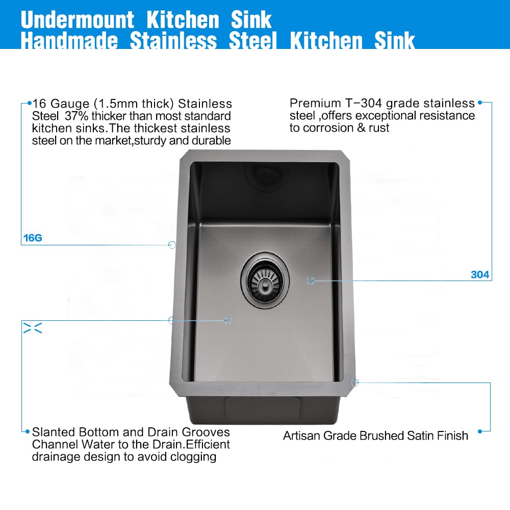 Geräuschunterdrückung und Feuchtigkeitsbarriere: 3 mm Schallschutz-Unterbeschichtung und dicke Gummipolsterung, ultra-leises Design mit dickeren und weicheren Gummi-Geräuschunterdrückungspads. Artikel: Küchenspülen Details: Details: Produktabmessungen: 38,1 x 45,7 x 25,4 cm. Anzahl der Becken: 1 ZUBEHÖR Enthaltene Komponenten: Spüle, Spülgitter, Ausschnittschablone, Montagehalterungen. Hochwertiges Material: Die 30,5 cm große Spüle ist aus hochwertigem 16-Gauge-dickem T304-Edelstahl für überlegene Stärke und Haltbarkeit MONSINTA Schwarze Küchenspüle, 33 cm Unterbau-Barspüle, 33 x 38,1 Kreatives Design: 15 x 18 Bar Spüle, 8,9 cm Standardablauf mit 3-teiligem Korbsieb-Set verhindert, dass Schmutz das Abflussrohr verstopft, unteres Geschirrgitter kann Kratzer und Austrocknen der Spüle verhindern. Abgeschrägter Boden und X-förmige schnelle Entwässerung: Diese Unterbauspüle mit X-förmigen Ablaufrillen, kleines Bodenabflussloch-Design um das Ablaufloch und die X-Rillen-Wasserführungslinie an der Unterseite, wodurch Wasser schneller entfernt werden kann. Stärke 16 GA Installationsmethode: Unterbau., Lieferumfang: 1 Stück. Anti-Kondensation, verdickende Geräuschreduzierung, absorbiert Schall von der Quelle und isoliert Kondensat. 2: Abgeschrägter Boden und X-förmige schnelle Entwässerung: Diese Unterbauspüle mit X-förmigen Ablaufrillen, kleines Bodenabflussloch-Design um das Ablaufloch und die X-Rillen-Wasserführungslinie an der Unterseite, wodurch Wasser schneller entfernt werden kann. Kratzfest und stabil: Hergestellt aus 16 Gauge Edelstahl, die Küchenspüle verleiht Ihrer Kücheneinrichtung mit ihrer schwarzen Oberfläche einen Hauch von moderner Eleganz. Das geräumige Einzelschüssel-Design bietet ausreichend Platz für Ihre Küchenanforderungen X-förmige Strömungslinie zur Vermeidung von Verstopfungen Gleichzeitig behält sie ein elegantes Aussehen und ist leicht zu reinigen, verhindert die 25,4 cm tiefe Einzelschale Spritzer. VOKIM Handgefertigte Edelstahl-Küchenspüle, handgefertigt von erfahrenen Handwerkern. Die schwarze, gebürstete Oberfläche aus Rotguss wird als äußere Schicht mit einer innovativen Nano-PVD-Technik aufgetragen, die wie Wasser auf Lotusblättern funktioniert – keine Wasserspuren, leicht zu reinigen und langlebig. 38,1 Cm Bar Unterbau Küchenspüle Schwarz-VOKIM 15x18 Küchenspüle Maße der Unterbauspüle: Außenmaße: 38,1 cm L x 45,7 cm B x 25,4 cm D, Innenmaße (L x B x H): 33 x 40,6 x 25,4 cm.