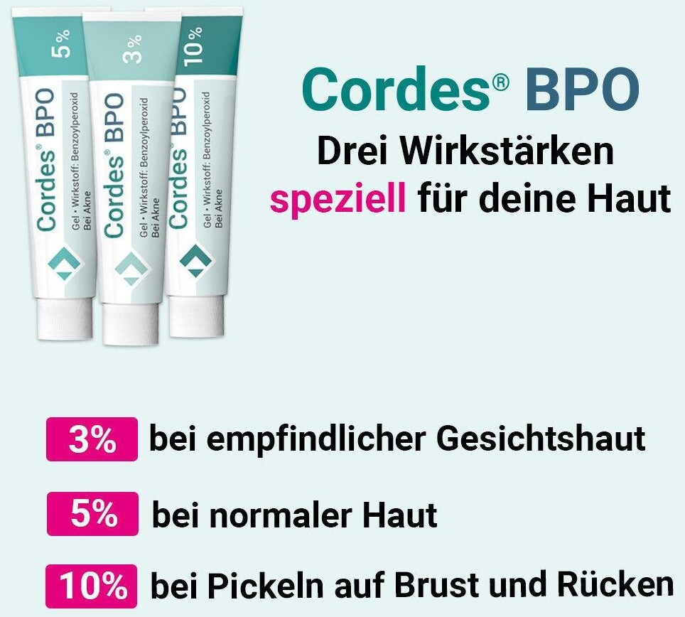 Gut zu wissen: Im Gegensatz zu Antibiotika, die häufig zur äußerlichen antibakteriellen Behandlung der Akne vulgaris eingesetzt werden, führt eine Therapie mit BPO nicht zu sogenannten Resistenzen. Im Gegensatz zu einer Behandlung mit Antibiotika gibt es bei Benzaknen® keine Begrenzung der Anwendungsdauer. 2) Antibakteriell Der Wirkstoff BPO setzt in den obersten Hautschichten reaktiven Sauerstoff frei und hemmt so das Wachstum der Bakterien, die Pickel verursachen. Mit Benzoylperoxid: Der bewährte Wirkstoff gegen Akne Cordes BPO – Welche Wirkstärke ist richtig für mich? Cordes BPO 3 % • Bei empfindlicher Gesichtshaut • Bei Beginn der Behandlung Du startest gerade mit der Aknetherapie? Du hast Mitesser und Pickel vor allem im Gesicht? Deine Haut reagiert darüber hinaus schnell gereizt und rötet sich schnell? In diesem Fall empfehlen wir Dir Cordes BPO 3 % Gel – die milde Formel für empfindliche Gesichtshaut. Antibakterielle Wirkung: BPO setzt in den oberen Hautschichten reaktiven Sauerstoff frei. Achte deshalb darauf, dass Du das Gel von Textilien fernhältst und verwende z., B. Benzaknen® Wash wird angewendet bei Jugendlichen (ab 12 Jahren) und Erwachsenen. Du erhältst das Gel ohne Rezept in deiner Apotheke. acnes – die Bakterienanzahl geht zurück. Als 30 g oder 100 g Tube. Zur Behandlung aller Formen der Akne in leichter Ausprägung sowie zur unterstützenden Therapie bei Akne mittlerer bis schwerer Ausprägung. Pflichtangaben: Benzaknen® Wash 5% Suspension zur Anwendung auf der Haut Wirkstoff: Benzoylperoxid.Anw. weiße Handtücher und Kopfkissen. Hin und wieder kannst Du auch ein mildes Peeling-Gel oder ein Enzym-Peeling benutzen, um abgestorbene Hautpartikel sanft von der Hautoberfläche zu lösen. Cordes BPO 10 % •Zur Anwendung auf Brust und Rücken •Wenn niedrigere Konzentrationen keine ausreichende Wirkung hatten Du möchtest Akne auf der Brust oder dem Rücken behandeln? Cordes BPO 5 % Gel hat keine ausreichende Wirkung gezeigt? Dann empfehlen wir Dir Cordes BPO 10 % Gel. Galderma Laboratorium GmbH, 40211 Düsseldorf Stand Pflichtangaben: 11/2023 Akne Creme – Die 16 besten Produkte im Vergleich 5 %: für normale Gesichts-Haut. Auch die Entstehung von neuen Mitessern wird durch die schälende Wirkung reduziert. Das Hautbild verbessert sich und das Risiko für Entzündungen und Hautirritationen wird reduziert. die betroffenen Stellen mit einem milden Waschgel, das Mitesser nicht fördert. Achte dabei immer auf saubere Hände. Wie wende ich Cordes BPO an? Schritt 1 – Reinigen Reinige Dein Gesicht bzw. Schritt 3 – Anwendung Cordes BPO Wenn Deine Haut vollkommen trocken ist, trage das Gel nur auf die Bereiche Deines Gesichts dünn auf, die wirklich von Akne betroffen sind (nicht einmassieren). Das Cordes BPO 10% Gel wird zur äußerlichen Behandlung von Akne-Erkrankungen in ihren verschiedenen Erscheinungsformen angewendet. Das Gel enthä Dadurch vermeidest Du Hautreizungen. Der Wirkstoff setzt in den obersten Hautschichten reaktiven Sauerstoff frei und stört so das Wachstum des Aknebakteriums C. Die Entfärbung wird oft erst nach dem Waschen sichtbar. Cordes BPO Akne Gel ist gut verträglich und und hat sich seit vielen Jahren in der Behandlung bewährt. Wie Lange Einwirken Cordes BPO 10% Gel 30 G Online Kaufen Cordes Bpo Akne Heilwirkung Vorteile von Benzaknen® Wash 5% bei leichter Akne an Gesicht und Körper Hautinfektion Problem, Pickel Grad und Typ Zyste, whitehead, Mitesser, Knötchen und Zystische. Die Enstehung von Mitessern und Pickeln wird reduziert. Das Wachstum von Akne-Bakterien, die Eiter-Pickel verursachen, wird so gehemmt. Beim Waschen solltest Du außerdem behutsam vorgehen: Massiere das Waschgel nicht ein und verzichte auf starkes Reiben, um Hautirritationen zu vermeiden. Nachgewiesene Wirksamkeit bei allen Formen der Akne vulgaris. acnes) und wirkt effektiv gegen Pickel und Mitesser. Cordes® BPO 3 Du kannst Cordes BPO Gel also regelmäßig anwenden, ohne dass seine Wirkung auf die Bakterien nachlässt. Am besten tupfst Du Deine Haut trocken. Wasser und Seife reichen jedoch nicht aus, um Akne auslösende Bakterien zu bekämpfen. Die Wirksamkeit von BPO bei endogen bedingter Akne ist, im Gegensatz zu vielen Produkten aus der Drogerie, durch wissenschaftliche Studien belegt. Cordes BPO ist in 3 Wirkstärken verfügbar: 3 % für empfindliche Gesichts-Haut. Cordes BPO Akne Gel enthält den medizinischen Wirkstoff Benzoylperoxid (BPO) in einem leichten Gel zum Auftragen auf die Haut. Hilft schnell: Bereits nach 2 Wochen ein sichtbar verbessertes Hautbild Achte dazu auf Produkte mit dem Hinweis „nicht komedogen“.