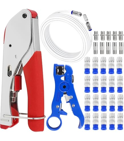 F Stecker Set RG59 RG6 Koaxialkabel-Crimper-Werkzeug, Koaxial-Kompressionswerkzeug Kompressionszange F Stecker Je nach Dicke des isolierten Kabels das Werkzeug am Kabel befestigen, dann 3 bis 7 Kreise im Uhrzeigersinn drehen und schließlich den unnötigen Teil abziehen Geeignet für RG59, RG59 Quad, RG6, RG6 Quad und RG58, 3V, 2V, 4C, 5C, unterdrückt 75-5-7 metrische und imperiale F-Kopf. Anschlüsse: F-Stecker bieten eine sichere Verbindung für RG6-Koaxialkabel, O-Typ-Dichtungssystem kann verhindern, dass Wasserdampf in das Gelenk gelangt. Der Koaxialkabel-Crimper ist ein vielseitiges Werkzeugset, das sowohl zum Crimpen von Koaxialkabeln als auch von Kabelanschlüssen geeignet ist. Es enthält eine Crimpzange, eine Abisolierzange, 20 F-Stecker und einen Inbusschlüssel. Mit diesem Set können Sie Kabel effizient und präzise verarbeiten 2er Crimp- Abisolierzangen SET 50-teilig (Neu und originalverpackt) in Walzenhausen für CHF 10 Die 360-Grad-Radialkompression bietet Integrität und hervorragende HF-Leistung Produktverpackung: 1 x Crimpzange, 1 x Abisolierwerkzeug, 20 x blaue Stecker, 5 x schwarze Stecker.