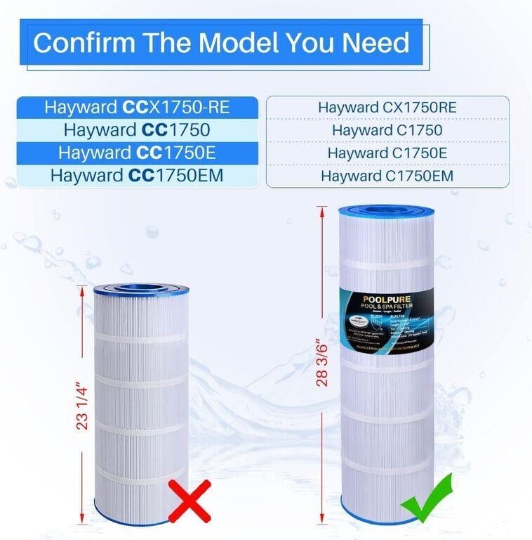 Cryspool Pool Filter Compatible with C1750, Hayward CX1750RE Für eine optimale Leistung empfehlen wir, alle sechs Wochen zu reinigen, um einen sauberen und glücklichen Pool zu erhalten. Spezifikationen: Höhe 71 cm; Außendurchmesser: 21 cm; Öffnung oben: 10,2 cm; untere Öffnung: 10,2 cm; Filterbereich: 175 m²., ft Kompatible Modelle: Kompatibel mit Hayward PA175, C1750, C17502, C17502S, Unicel C-8417, Filbur FC-1294, Sta-Rite Posi-Clear PXC175, Waterway Proclean PCCF-175, 25230-0175S, Aladdin 275., 501, 80 cm. Cryspool Poolfilter Kompatibel Mit C1750, Hayward CX1750RE, PA175 Pflegeleicht: Das trilobale Stoffdesign macht die Reinigung mühelos und sorgt für eine problemlose Wartung. 【Schmutz-Locking-Technologie: Unsere Pool-Filterkartusche verfügt über ein innovatives Trilobal-Gewebe mit 25–45 % höherer Kapazität als Standardgewebe. Verbesserte Haltbarkeit: Mit 25 % dickerem Filtrationsgewebe, chlorbeständigen Endkappen, bruchfester Konstruktion und Kohlefaser-Innenkern sorgt unser Filter für eine längere Lebensdauer als gewöhnliche Filter, ohne Risse zu entwickeln.
