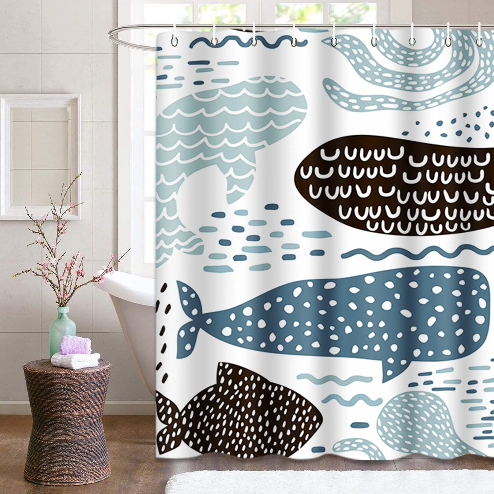 VaryHome Abstract Shower Curtain With Sea Animal Fur Seal Whale Octopus Fish Child Pastel Blue Baby Brush Waterproof Polyester Fabric 72 X 72 Inch Set With Hooks